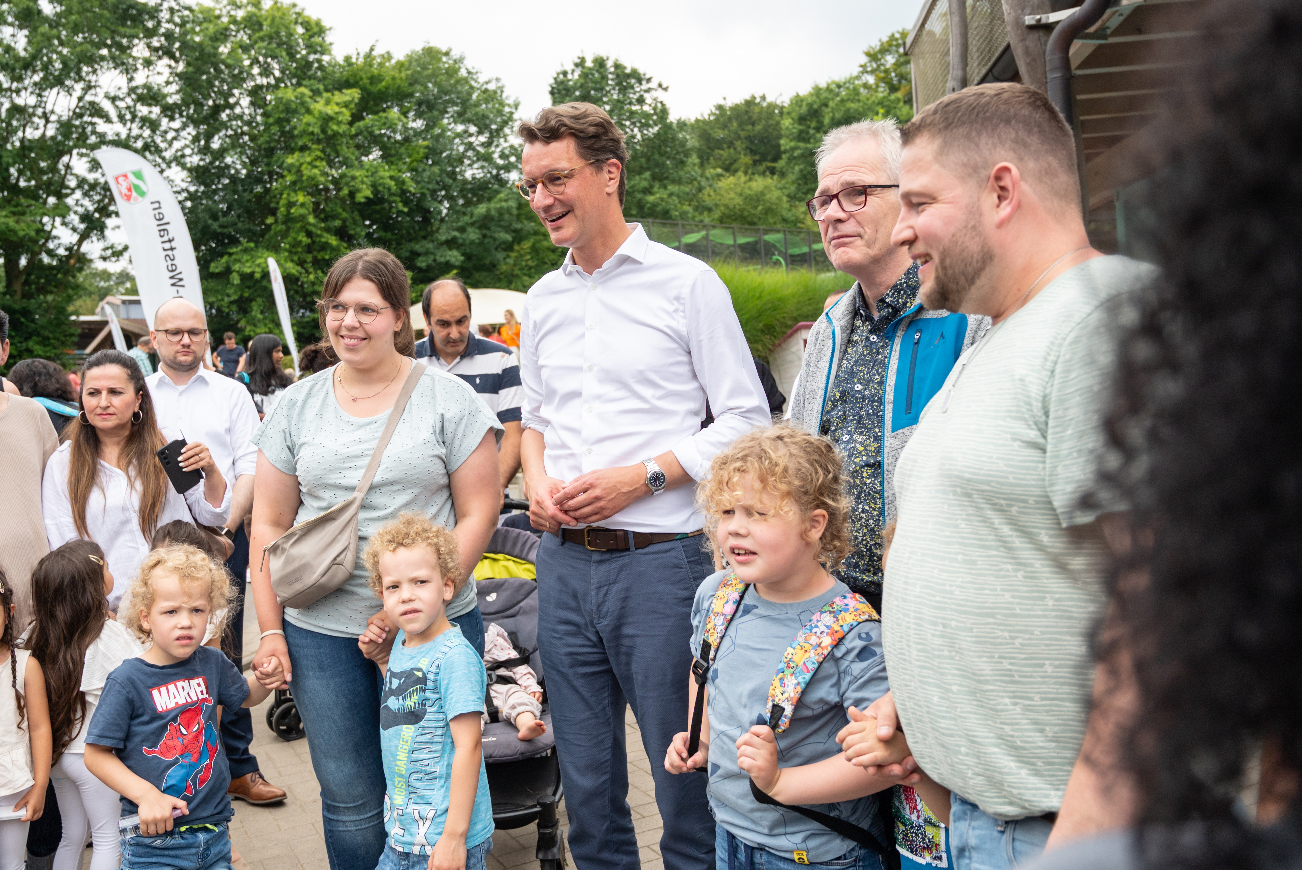 Ministerpräsident Hendrik Wüst trifft am Mittwoch, 7. August 2024, seine Ehrenpatenkinder und deren Familien im Freizeitpark Ketteler Hof in Haltern am See. Im Jahr 2019 hat die Landesregierung das Mehrlingsgeld in Höhe von einmalig 1.000 Euro pro Kind für Drillinge oder mehr gleichgeborene Kinder in Nordrhein-Westfalen wiedereingeführt und würdigt damit die Leistung kinderreicher Familien. Der Ministerpräsident übernimmt die Ehrenpatenschaft für Mehrlinge, die in Nordrhein-Westfalen geboren werden – aktuell ist er Ehrenpate von 717 Kindern.