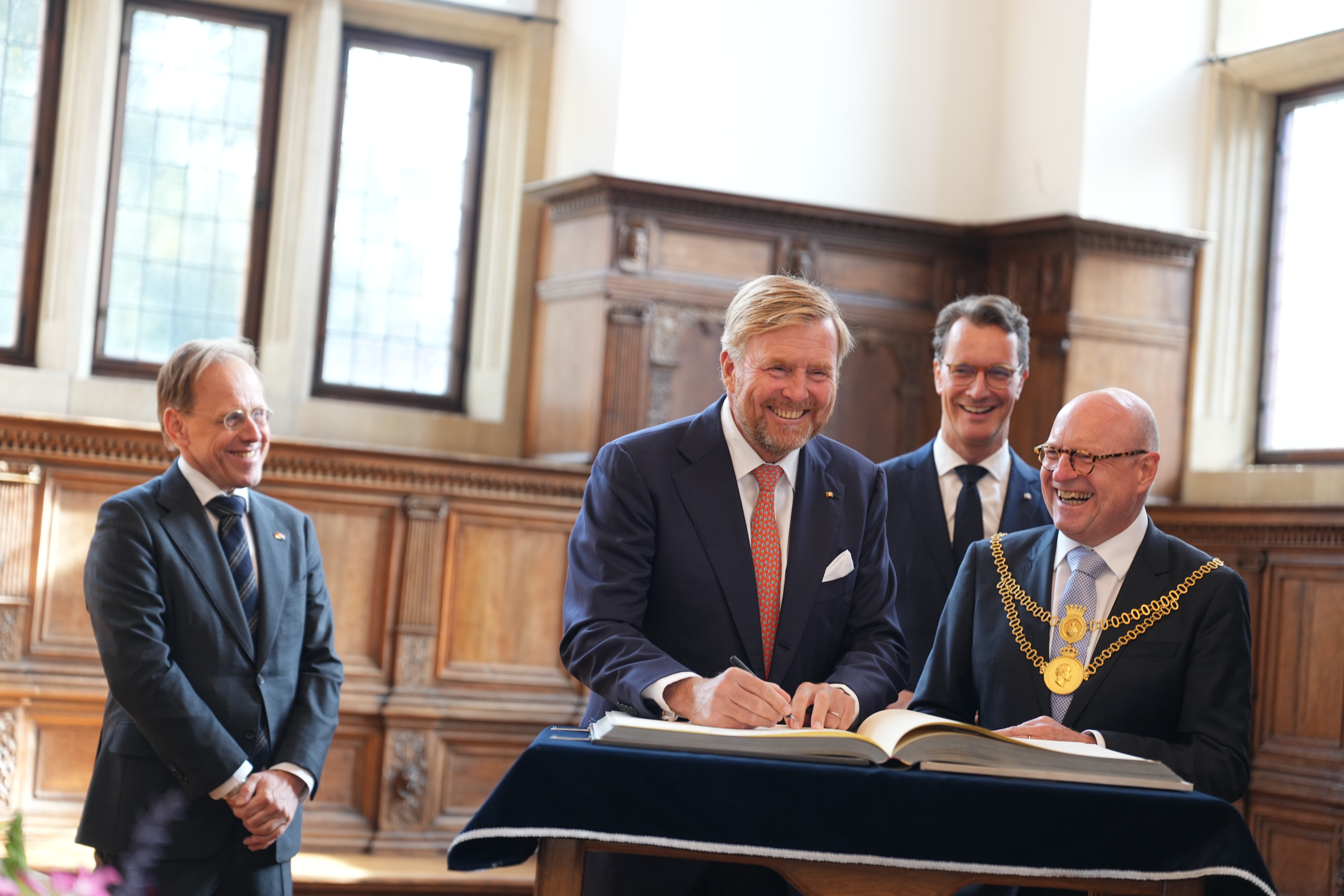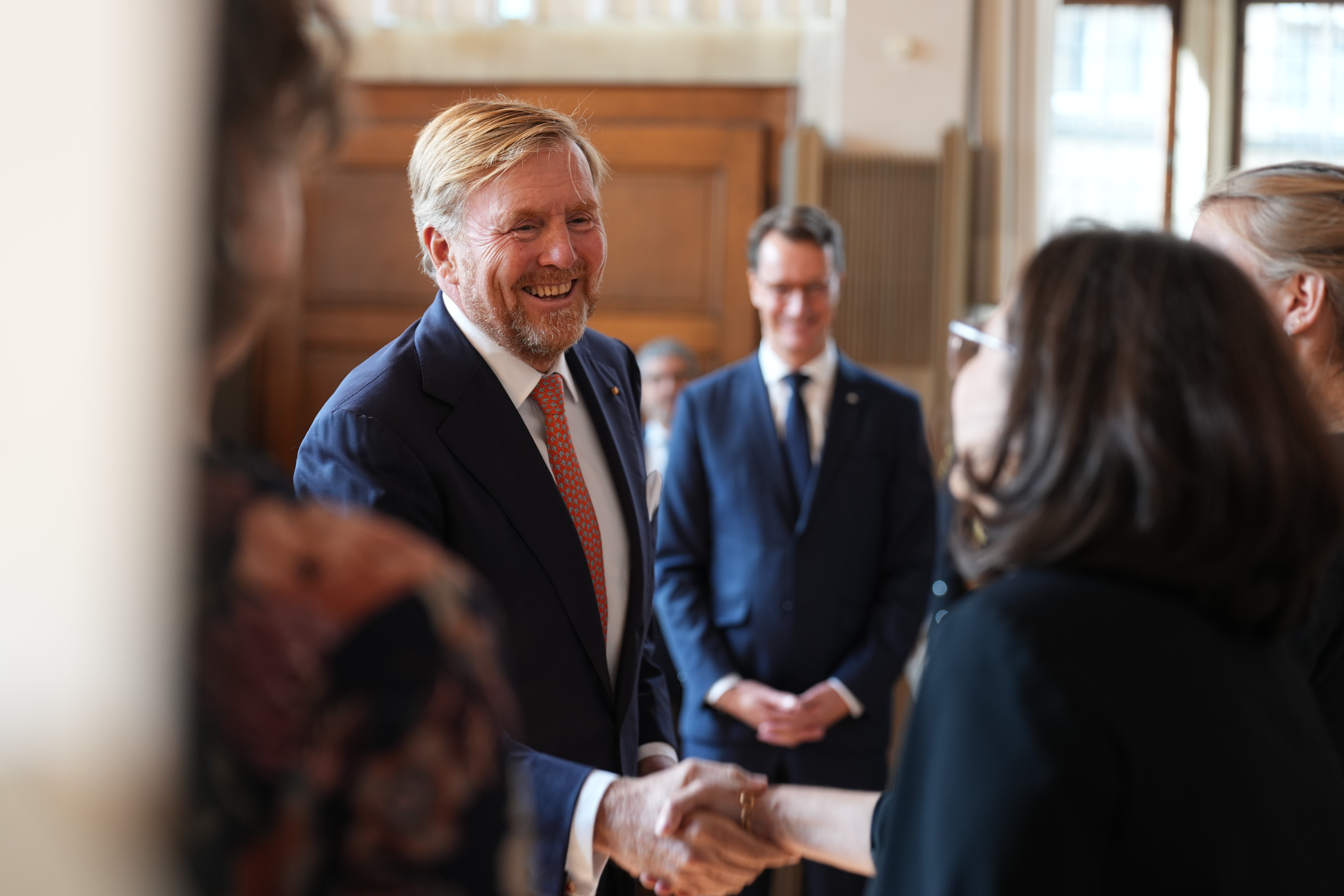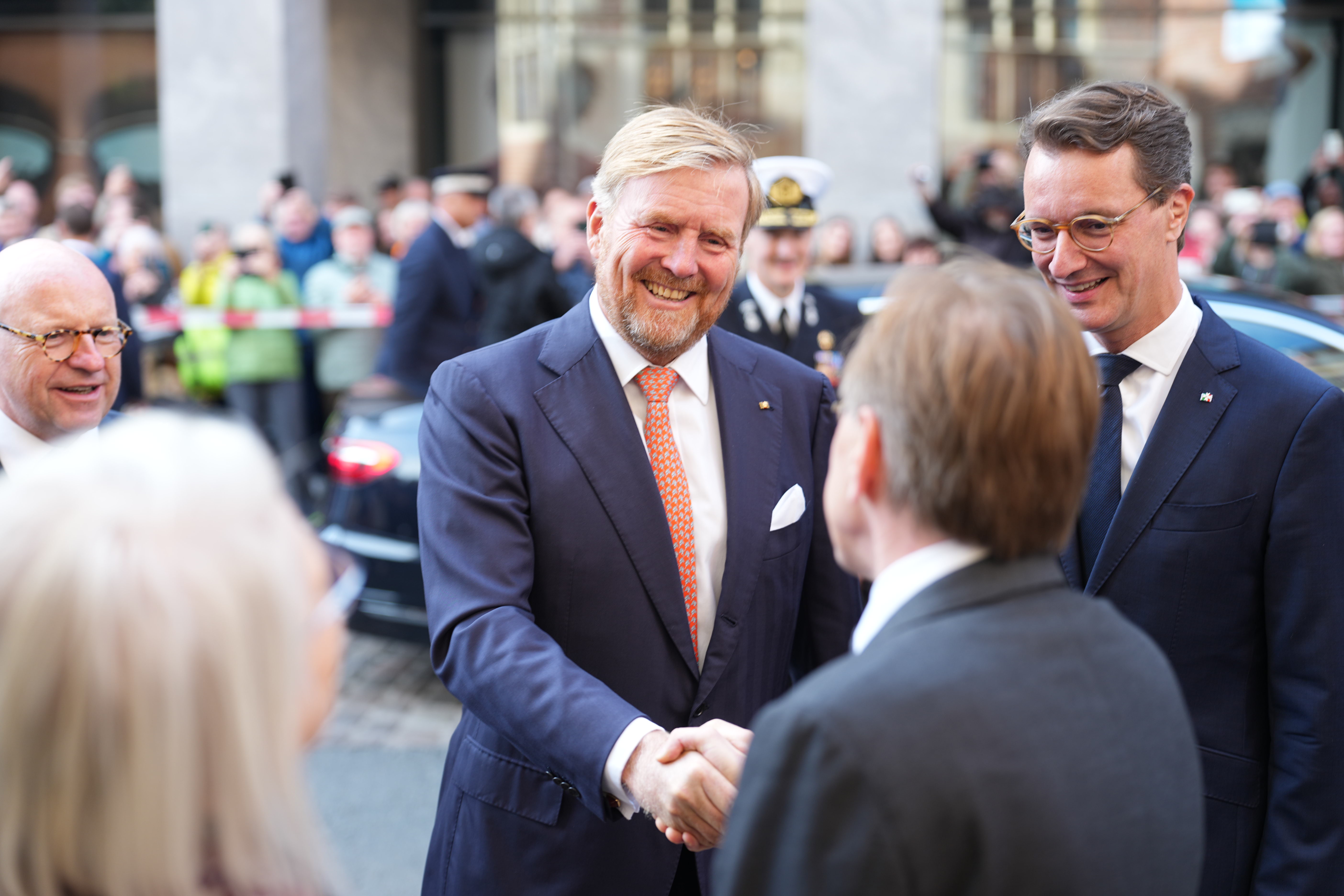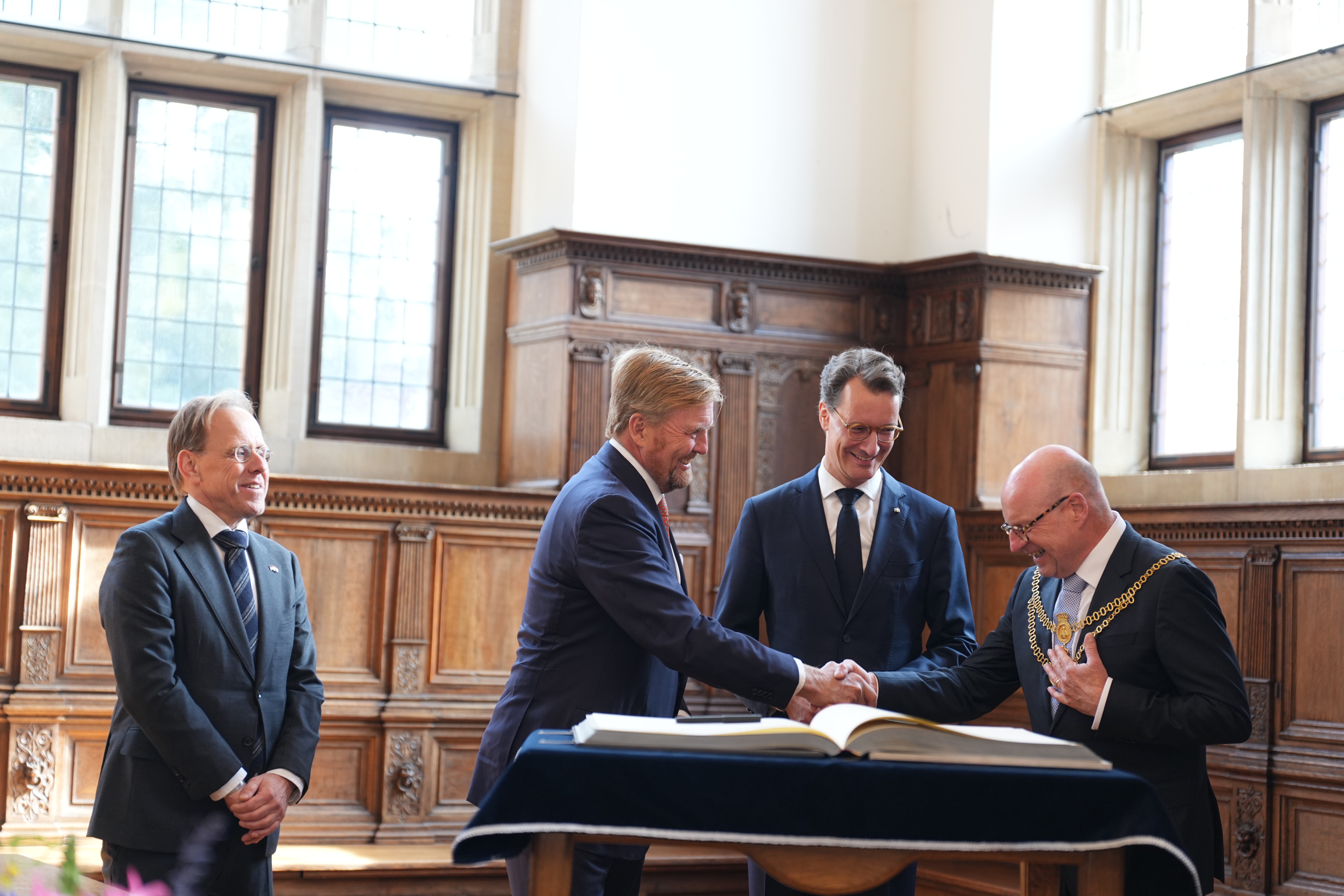 Am Vormittag besucht König Willem-Alexander gemeinsam mit Ministerpräsident Hendrik Wüst das Haus der Niederlande in Münster. Anlass ist das 30-jährige Bestehen der Einrichtung. Das ehemalige Krameramtshaus in Münster, erbaut 1589, diente über zwei Jahrhunderte der Kramergilde als Versammlungs- und Lagerhaus. Während der Verhandlungen zum Westfälischen Frieden residierten hier niederländische Gesandte, und im Kaminzimmer wurde 1648 der Friedensvertrag zwischen den Niederlanden und Spanien unterzeichnet. 1995 zog das Haus der Niederlande ein, eröffnet im Beisein von Kronprinz Willem-Alexander und Prinz Philippe. Heute beherbergt es universitäre Einrichtungen und dient als Ort für Forschung, kulturelle Veranstaltungen und deutsch-niederländischen Austausch. Bei einem Rundgang informiert sich der König über die heutige Rolle des Hauses, die Niederlande-Strategie der Universität Münster sowie über aktuelle Formate der grenzüberschreitenden Zusammenarbeit.