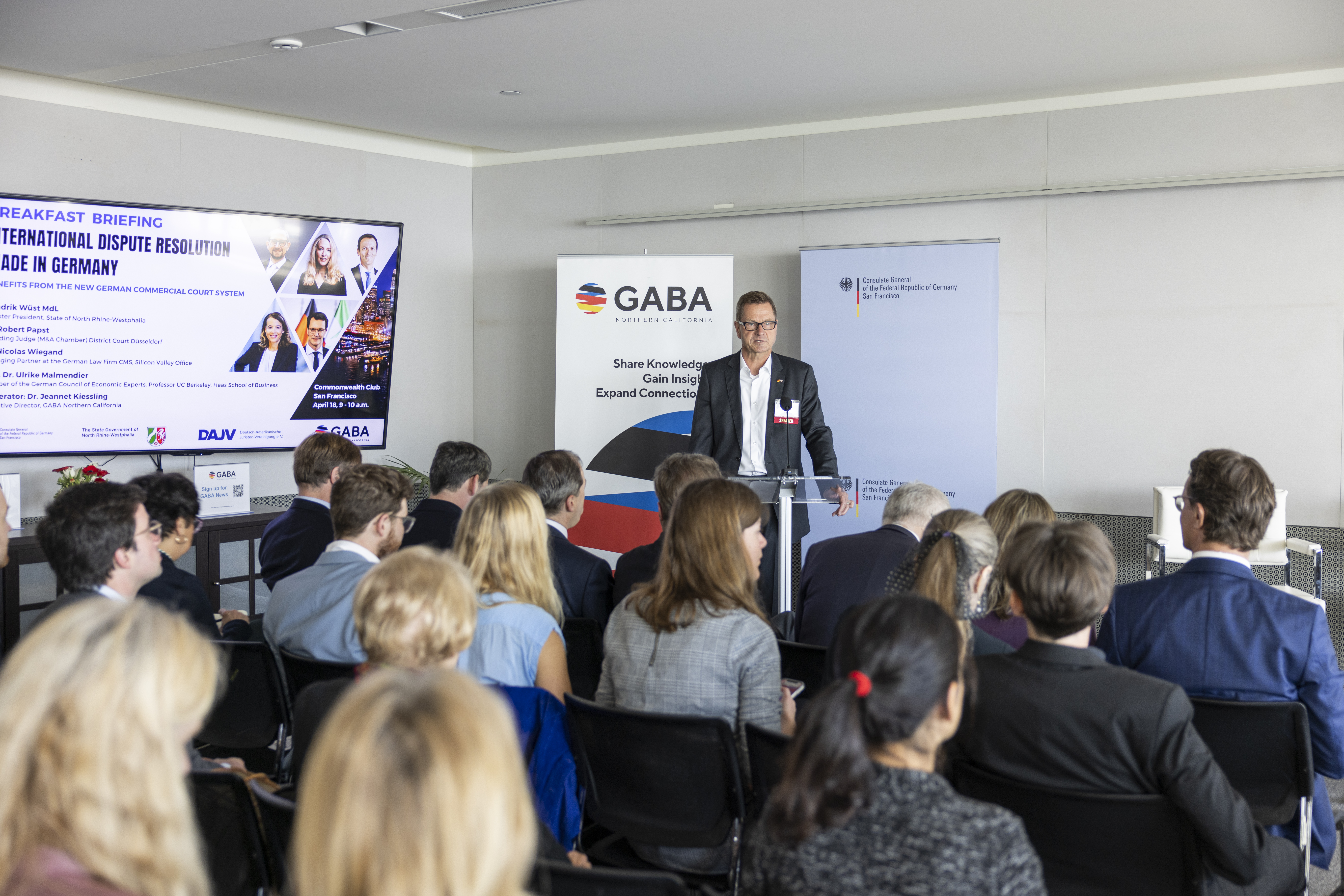 Die Veranstaltung in San Francisco unter dem Titel „International dispute resolution made in Germany – benefits from the new German commercial court system“ richtete sich an Anwältinnen und Anwälte sowie Unternehmen in den USA, insbesondere der Bay Area. Aus Nordrhein-Westfalen nahm auch Dr. Robert Papst, Vorsitzender Richter der M&A-Kammer beim Landgericht Düsseldorf, teil. Die Kammer entscheidet alle Verfahren aus Unternehmenskaufverträgen landesweit, wenn sie einen bestimmten Streitwert überschreiten. Die Arbeitsweise in Düsseldorf steht exemplarisch für die Attraktivität der neuen Verfahrensführung in Deutschland und orientiert sich in der Prozessführung an internationalen Standards der Anwaltschaft. Die M&A Kammer am Landgericht Düsseldorf hat am 1. Januar 2022 ihre Arbeit aufgenommen.