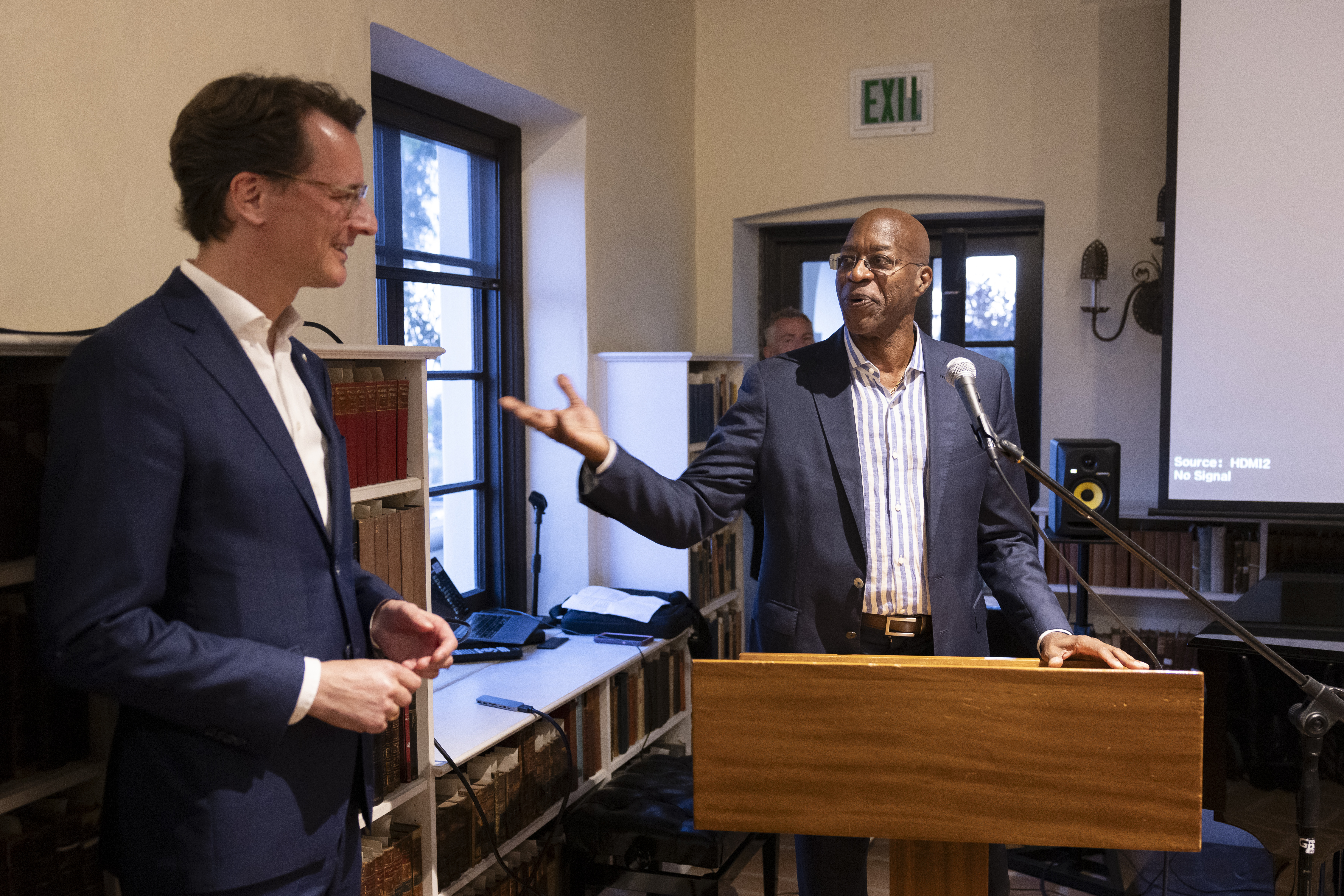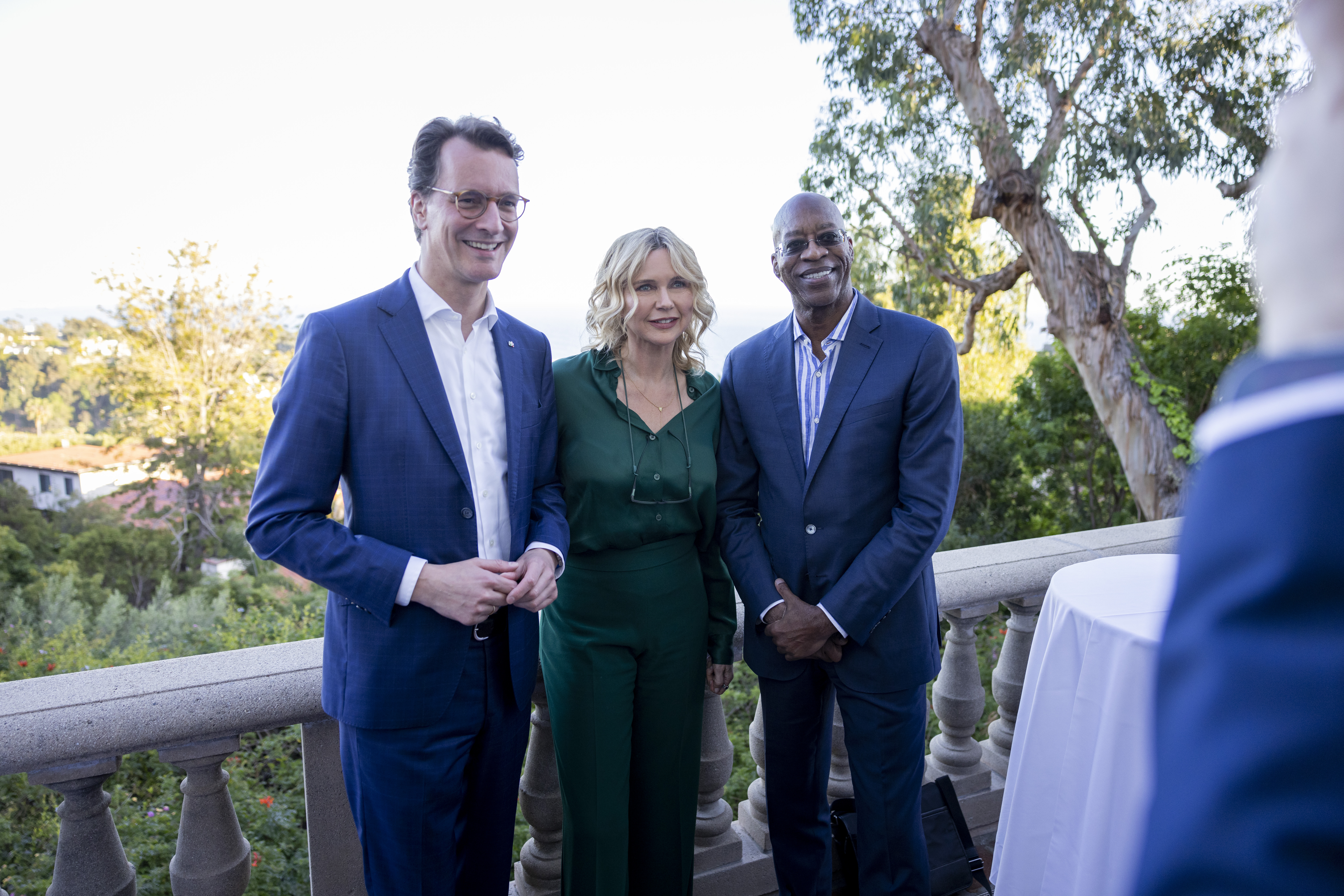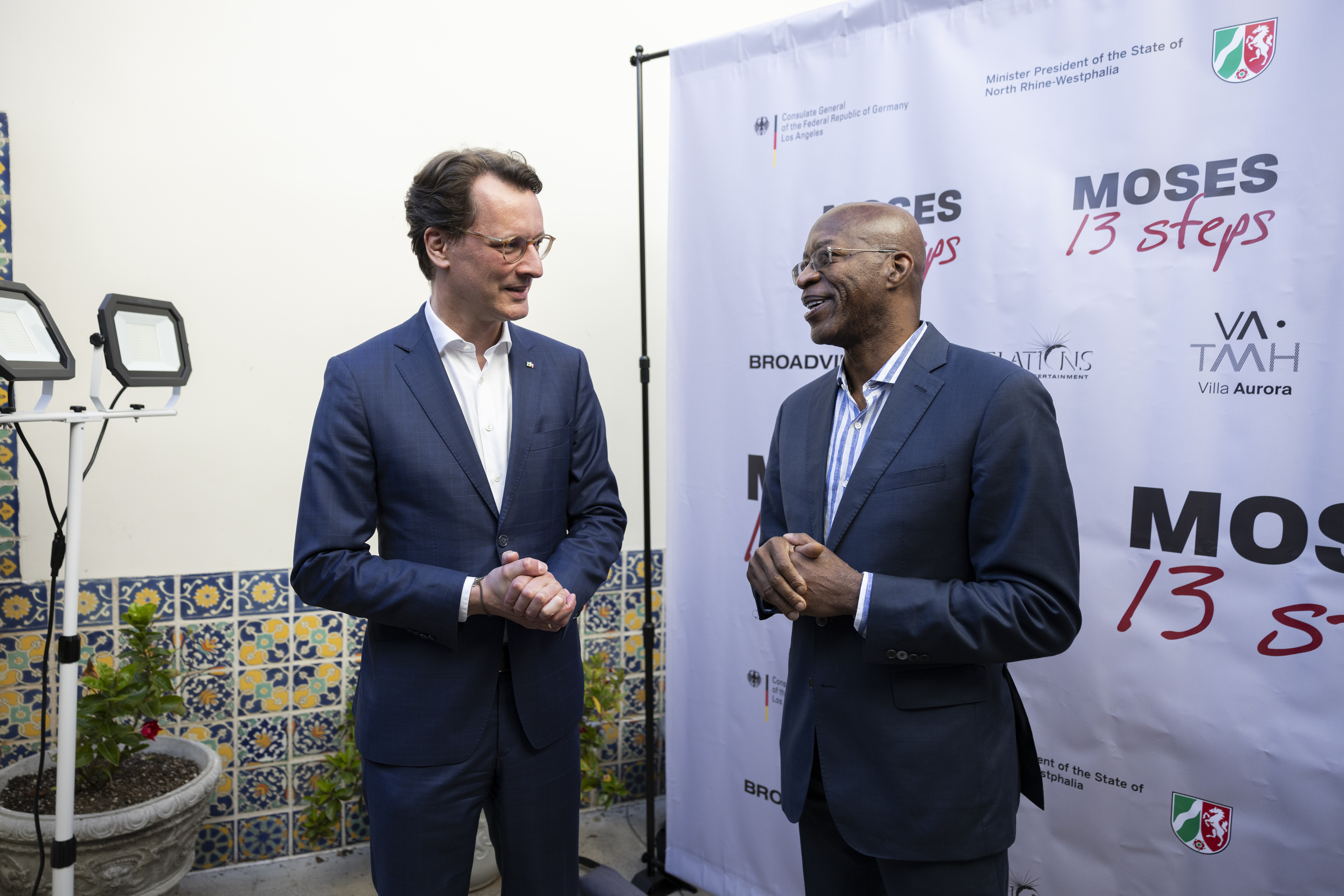Zum Auftakt seiner Reise in die Vereinigten Staaten von Amerika hat Ministerpräsident Hendrik Wüst am Montag, 15. April 2024, im Rahmen eines Themenabends im Zentrum der amerikanischen Filmindustrie in Los Angeles für den Film- und Medienstandort Nordrhein-Westfalen geworben. Zuvor wurde der von der Film- und Medienstiftung NRW geförderte Dokumentarfilm „MOSES – 13 Steps“ über die Ikone der Olympischen Spiele 1984 in Los Angeles Dr. Edwin Moses bei einer Filmpräsentation einem breiten internationalen Publikum vorgestellt. Der Kino-Dokumentarfilm ist eine Produktion der Kölner Firma Broadview Pictures. Produzent ist Emmy-Preisträger Leopold Hoesch, Executive Producer ist Oscar-Preisträger Morgan Freeman. An der Filmpräsentation und dem Themenabend in der Villa Aurora nahmen neben Ministerpräsident Wüst auch der Geschäftsführer der Film- und Medienstiftung NRW Walid Nakschbandi, der Filmproduzent und Geschäftsführer von Broadview Pictures Leopold Hoesch, Lori McCreary von Revelations Entertainment sowie Edwin Moses selbst teil. Internationale Film- und Sportgrößen wie Schauspielerin und Produzentin Veronica Ferres, Basketball-Weltmeister Daniel Theis, Schauspieler James Pickens Jr., bekannt aus der Erfolgsserie Grey’s Anatomy, und führende Vertreterinnen und Vertreter von Filmstudios und Filmverleihern wie Sam Semon von Amazon Studios, Jay Roewe von HBO, Matt Monos von Peacock, Colleen Dominguez und Moe Mirghahari von CMD Productions sowie Jennifer Daly von Critical Content folgten ebenfalls der Einladung des Ministerpräsidenten. An ehemaligen Leichtathletikgrößen waren unter anderem der viermalige Olympiasieger im Schwimmen von 1976 John Nabers, der ehemalige Dreispringer Milan Thiff, der ehemalige Olympiateilnehmer von 1976 im Sprint Guy Abraham, der viermalige Olympiasieger im Turmspringen Greg Louganis, Olympiasieger von 1988 und Edwin-Moses-Bezwinger André Phillips sowie der langjährige Konkurrent von Edwin Moses und Olympiateilnehmer von 1984 Daniel Lee Harris, der 1987 die Siegesserie von Edwin Moses mit 122 hintereinander gewonnen Rennen riss, vor Ort.
