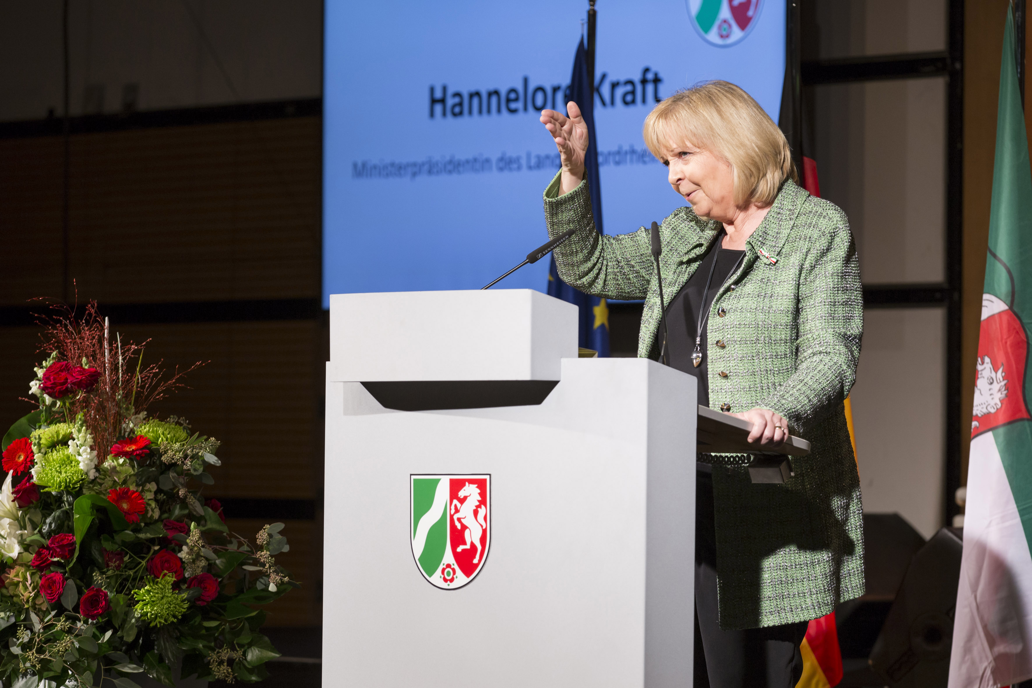 Ministerpräsidentin Kraft sagte: „Heute sind hier Männer und Frauen versammelt, die für das Beste in unserem Nordrhein-Westfalen stehen – und das seit Jahrzehnten. Für das Ehrenamt, für das solidarische Zusammenleben, dafür, dass Stärkere Schwächeren helfen. Weil Gemeinsinn und Gemeinwesen nur so funktionieren”, und sie hob hervor: „Unter ihnen sind Menschen mit ganz unterschiedlichen Lebensgeschichten und -entwürfen. Manche sind unserem Land von Geburt an verbunden, andere haben Nordrhein-Westfalen im Laufe ihres Lebens zu ihrer Heimat gemacht. Die Frauen und Männer, die den Landesverdienstorden tragen, haben sich oft über Jahrzehnte für andere Menschen eingesetzt. Und dafür verdienen sie unsere Bewunderung und unseren Respekt. Genauso wie die Trägerinnen und Träger des Staatspreises, die viele unterschiedliche, aber immer außergewöhnliche Leistungen für unser Land vollbracht haben.”