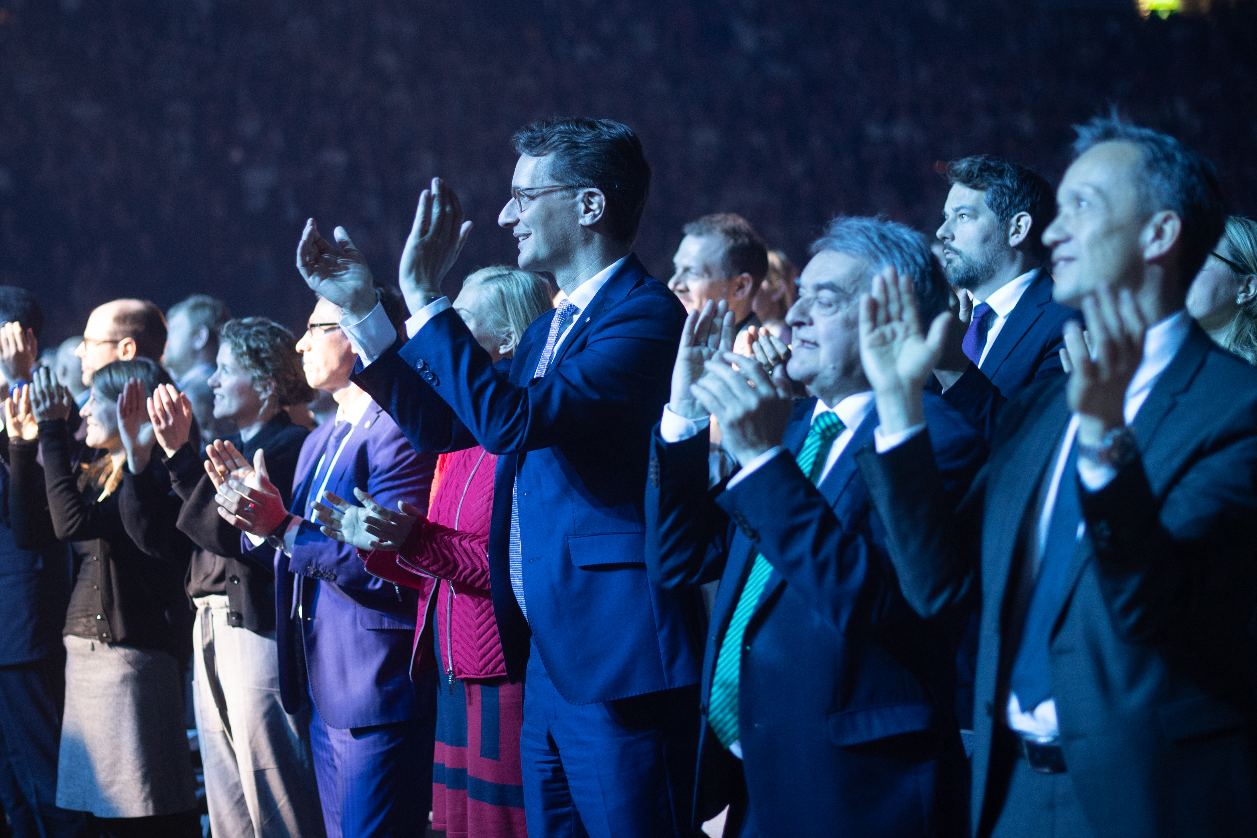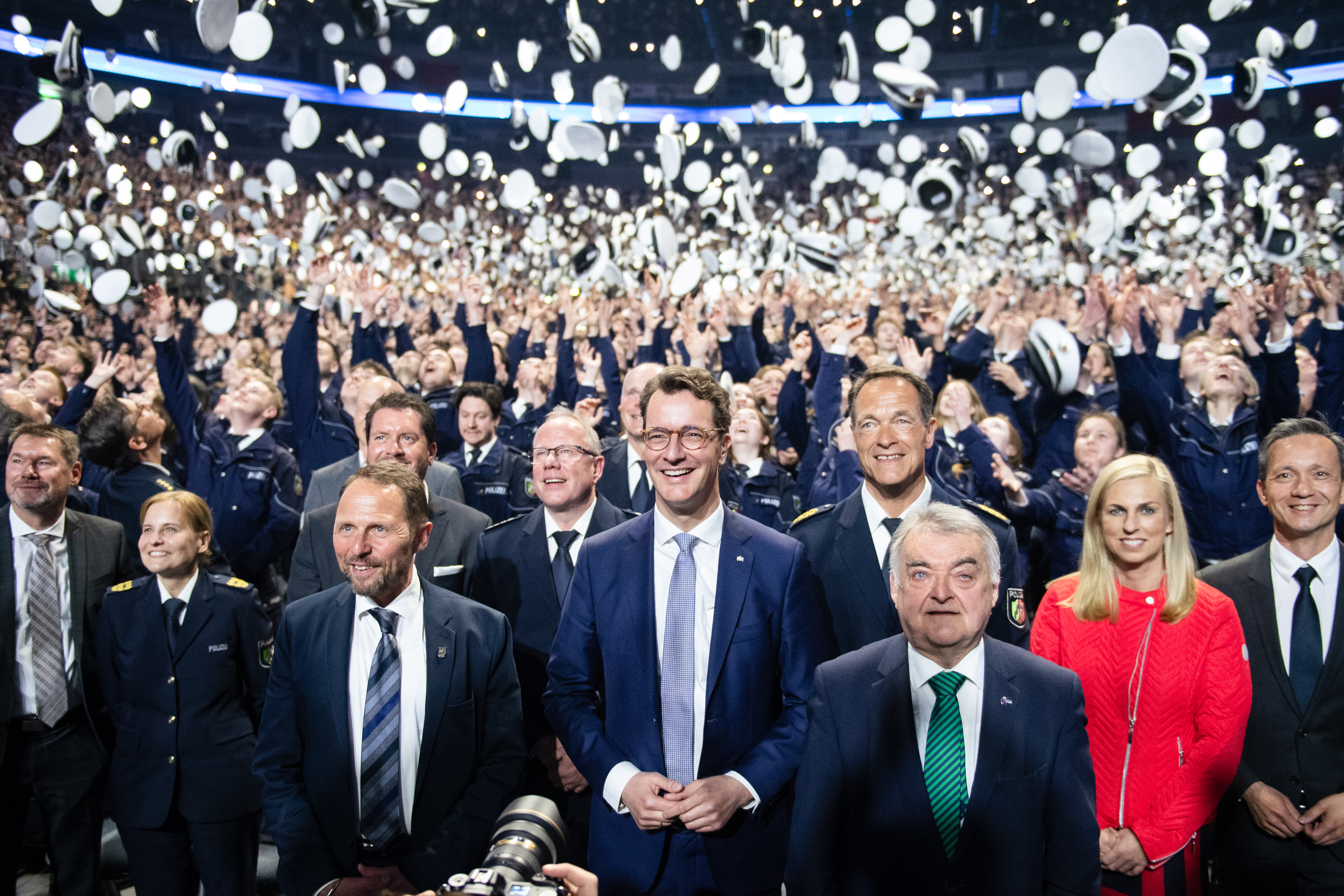 2.727 angehende Polizistinnen, Polizisten und Verwaltungskräfte haben am Mittwoch, 19. April 2023, ihren Diensteid feierlich geleistet. Kommissaranwärterinnen und Kommissaranwärter sowie Regierungsinspektoranwärterinnen und -anwärter der nordrhein-westfälischen Polizei schworen in der Kölner LANXESS Arena, dass sie das ihnen „übertragene Amt nach bestem Wissen und Können verwalten, Verfassung und Gesetze befolgen und verteidigen, [ihre] Pflichten gewissenhaft erfüllen und Gerechtigkeit gegen jedermann üben werden.“