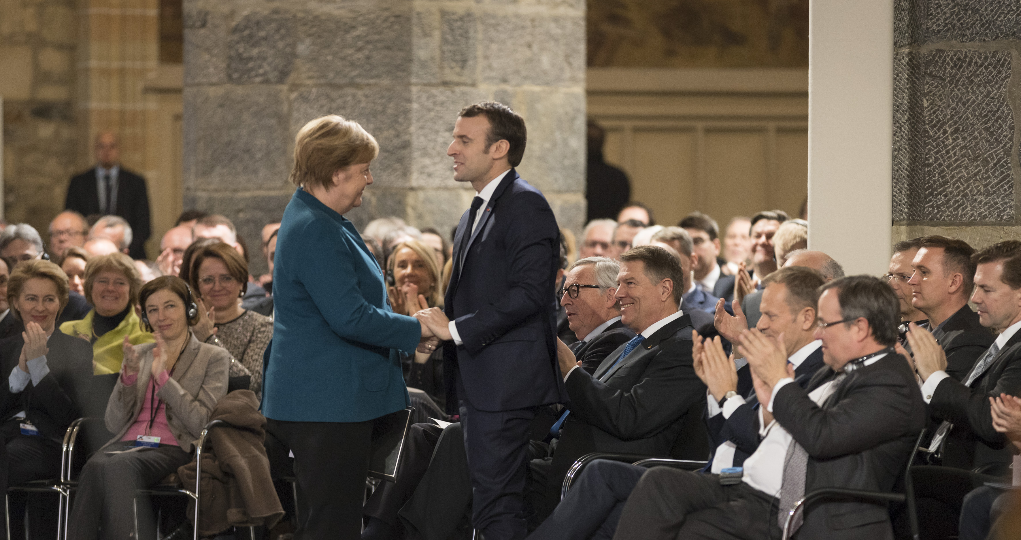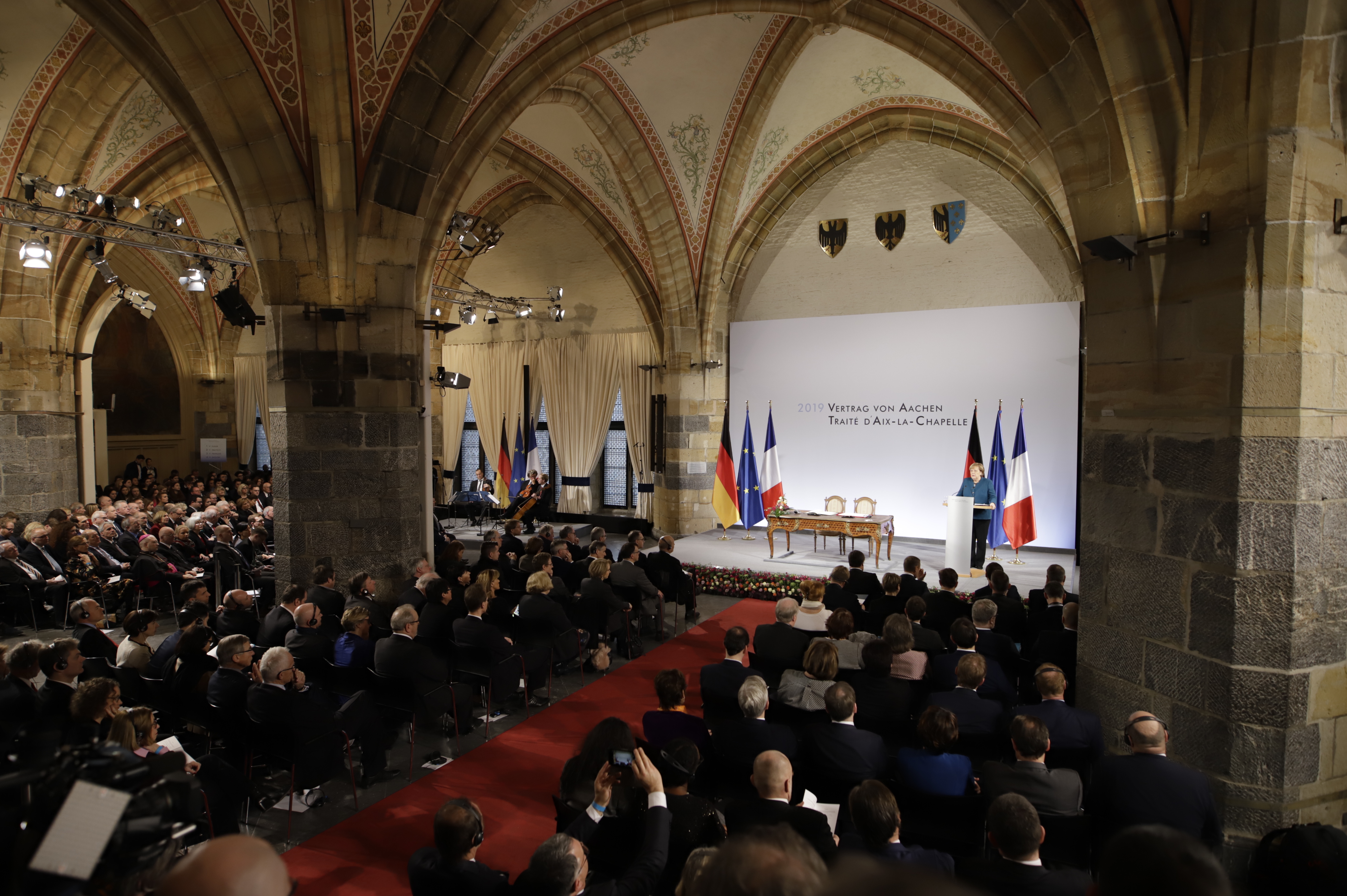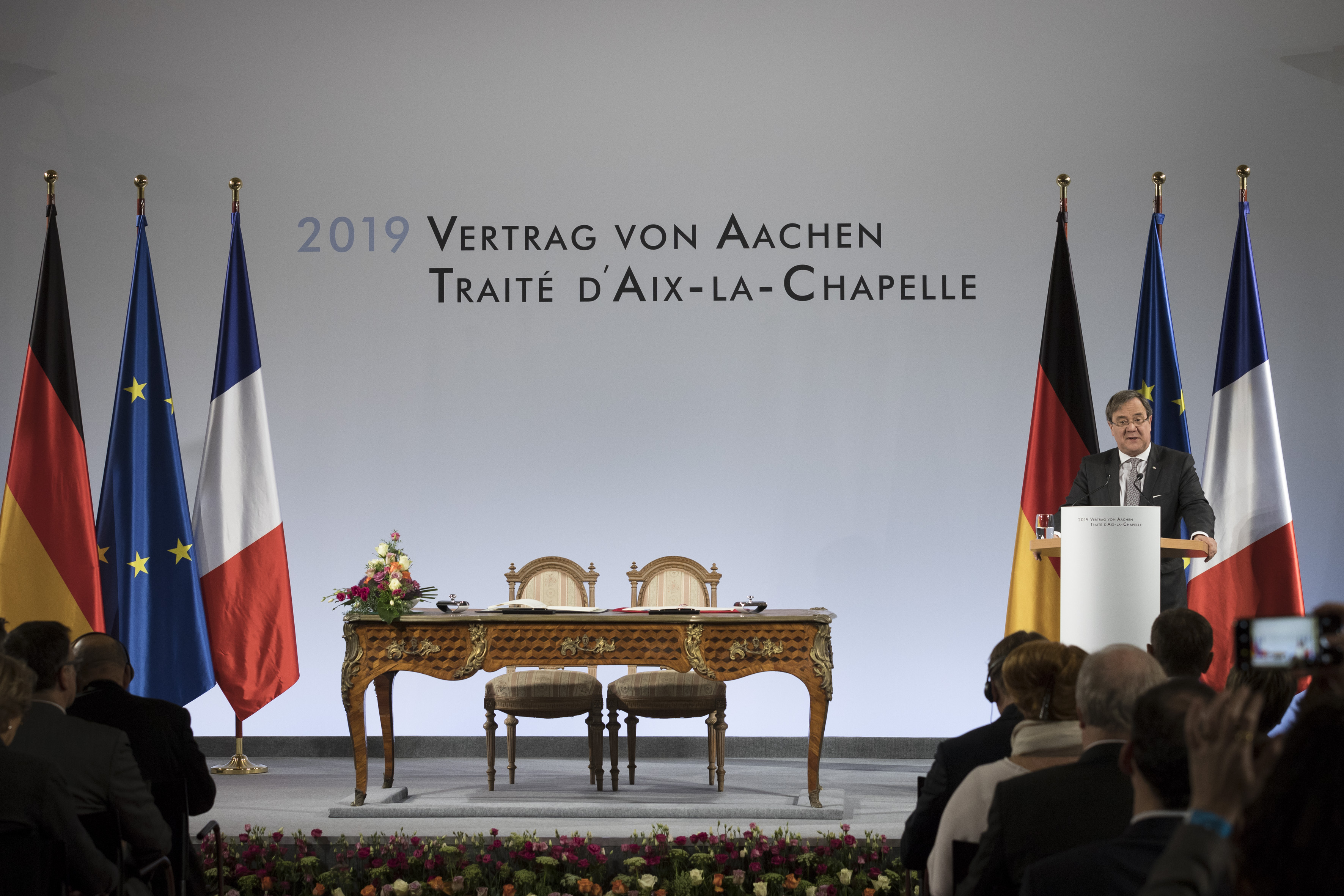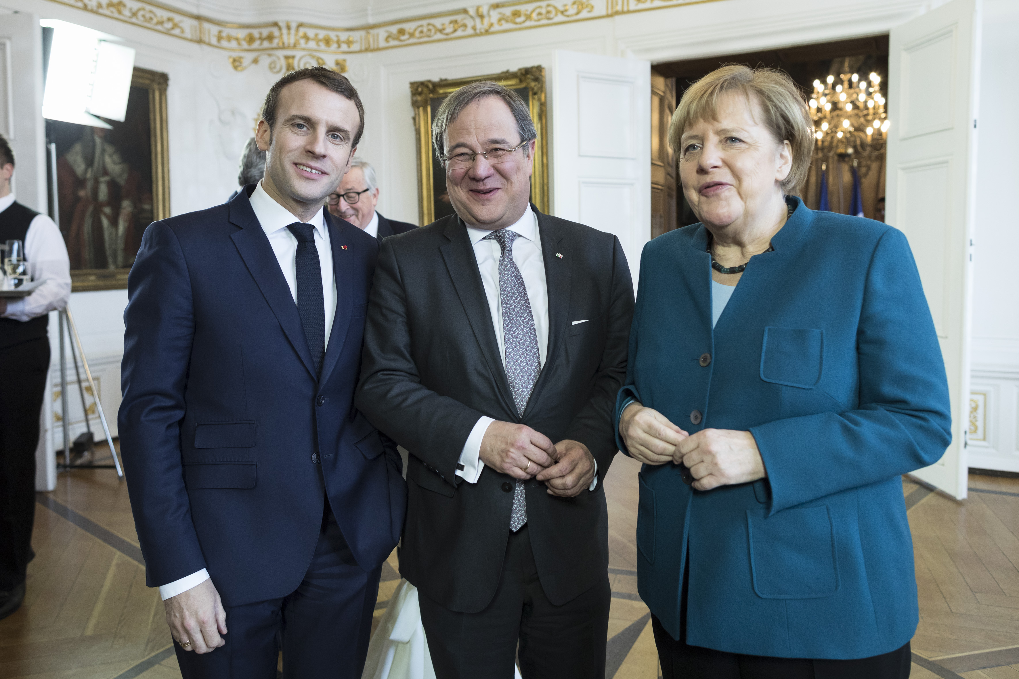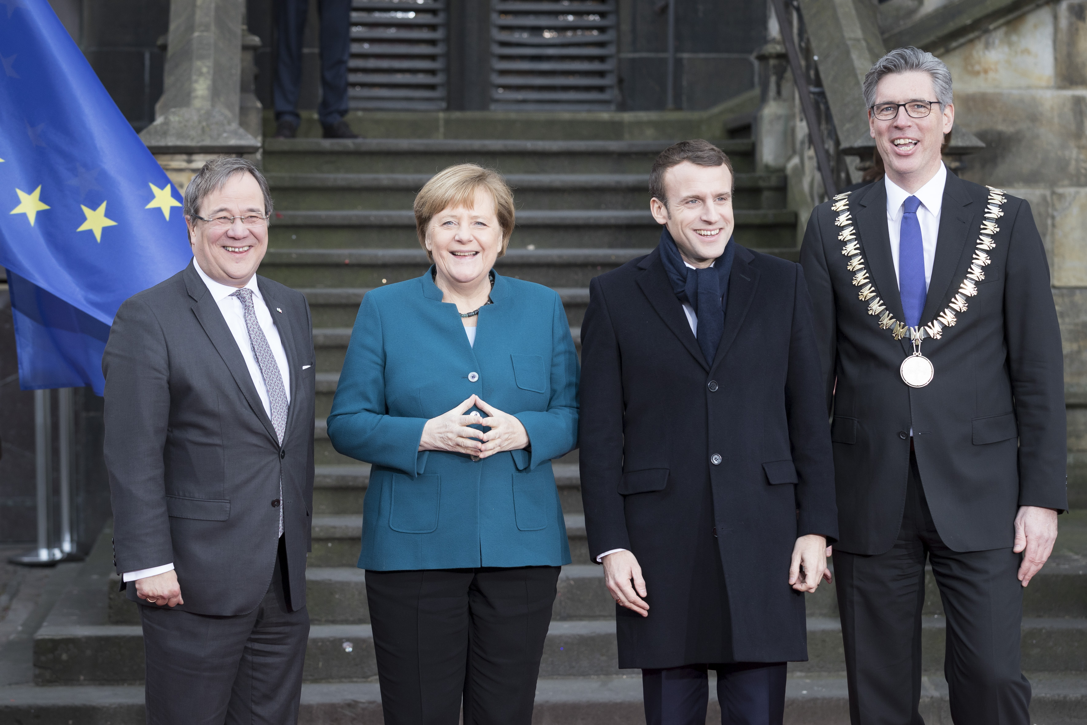 Neben Bundeskanzlerin Angela Merkel, Präsident Emmanuel Macron und Ministerpräsident Armin Laschet nahmen auch Donald Tusk, Präsident des Europäischen Rates, der rumänische Präsident Klaus Johannis als Vorsitzender der EU-Ratspräsidentschaft und Jean-Claude Juncker, Präsident der Europäischen Kommission, sowie Mitglieder des Bundeskabinetts und des nordrhein-westfälischen Landeskabinetts an der Unterzeichnungszeremonie im Rathaus teil. Ministerpräsident Armin Laschet hatte die Ehrengäste gemeinsam mit dem Oberbürgermeister der Stadt Aachen, Marcel Philipp, vor dem Rathaus begrüßt.