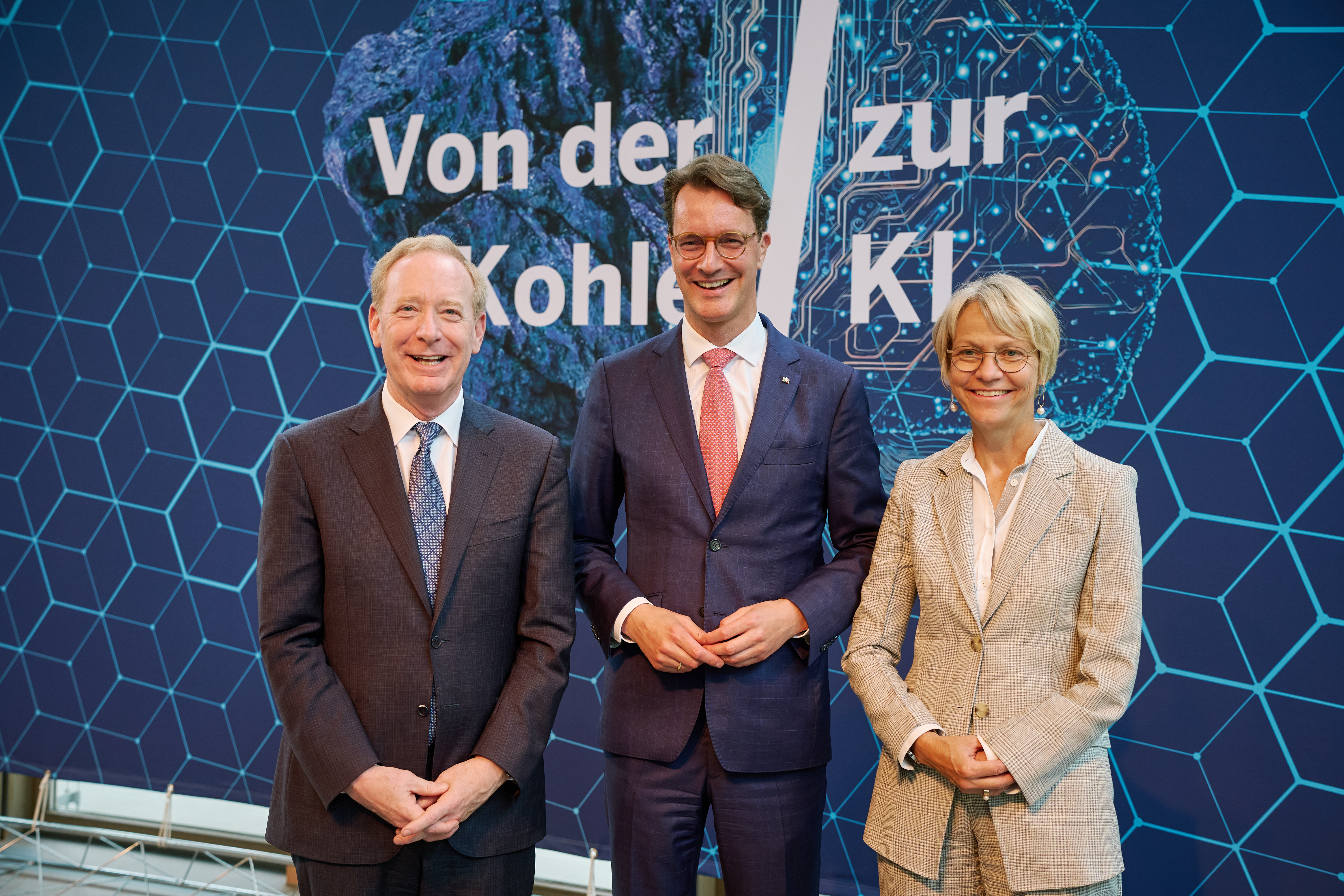 Ministerpräsident Wüst, Vice chair and President von Microsoft Smith und Schulministerin Feller wollen KI-Qualifizierung für Lehrkräfte, öffentliche Verwaltung und Auszubildende in die Fläche bringen