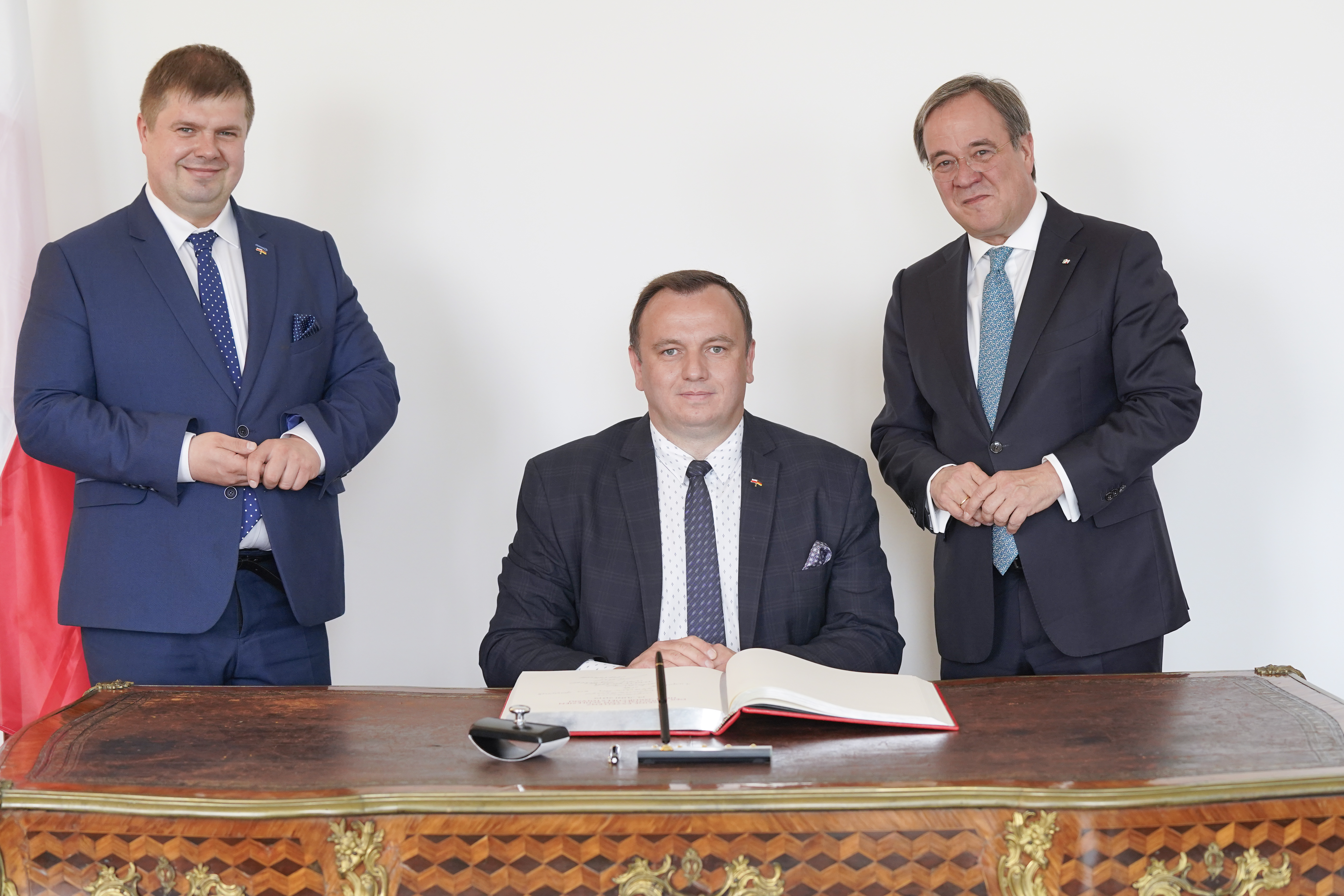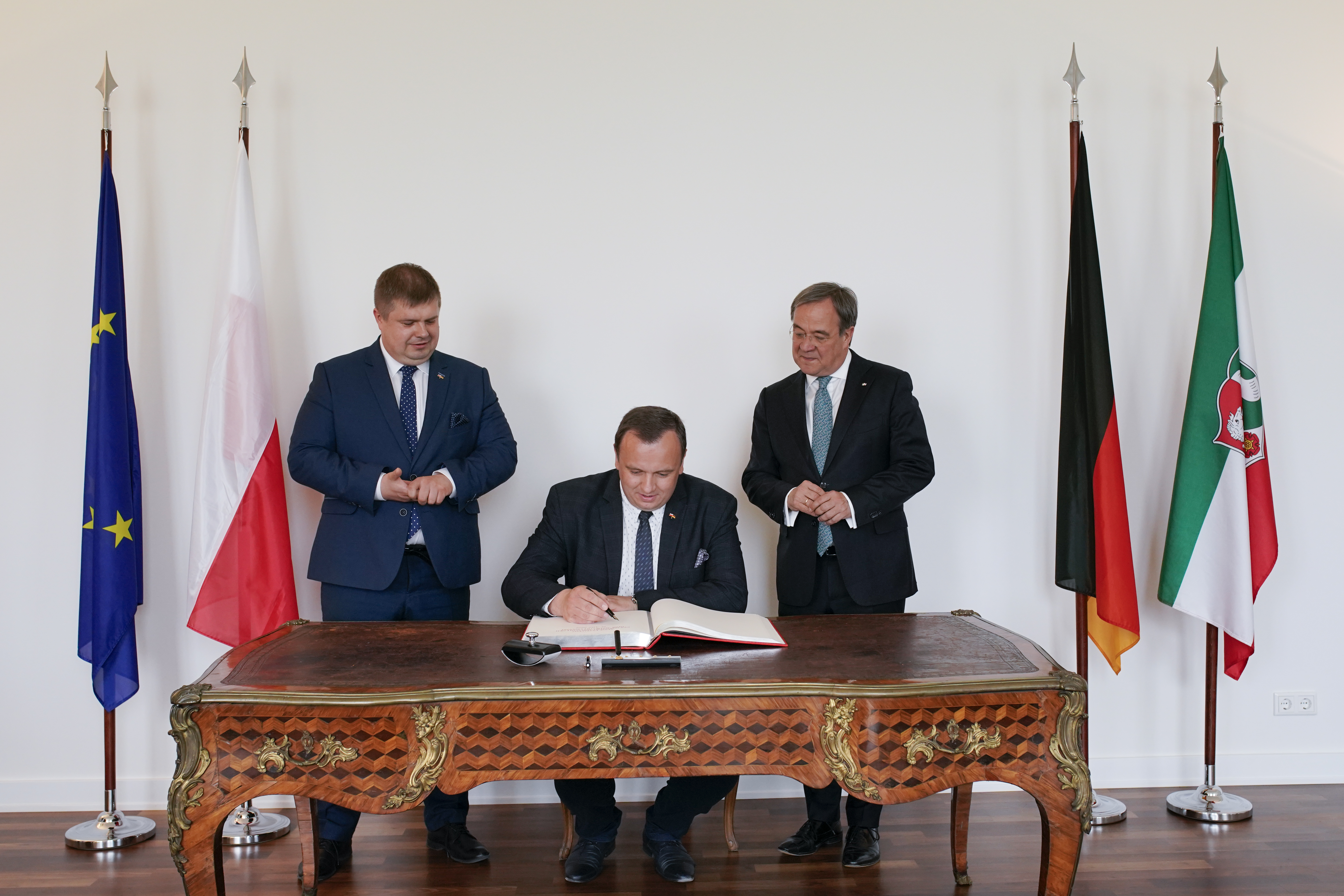 Nach der Begrüßung am Landeshaus trug sich Marschall Jakub Chełstowski in das Gästebuch der Landesregierung ein. Im Anschluss kamen Ministerpräsident Armin Laschet und der schlesische Regierungschef zu einem Gespräch zusammen. Ministerpräsident Armin Laschet: „Nordrhein-Westfalen ist mit Schlesien eng und auf vielfältige Weise verbunden. Die vielen Menschen, die seit dem 19. Jahrhundert in mehreren Migrationswellen zu uns gekommen sind und bei uns eine neue Heimat gefunden haben, prägen dieses Verhältnis maßgeblich. Die schlesischen Zuwanderer und ihre Familien haben zum Aufbau unseres starken Industrielandes beigetragen und das Ruhrgebiet maßgeblich geprägt. Sie sind ein wichtiger Teil unserer Identität.“