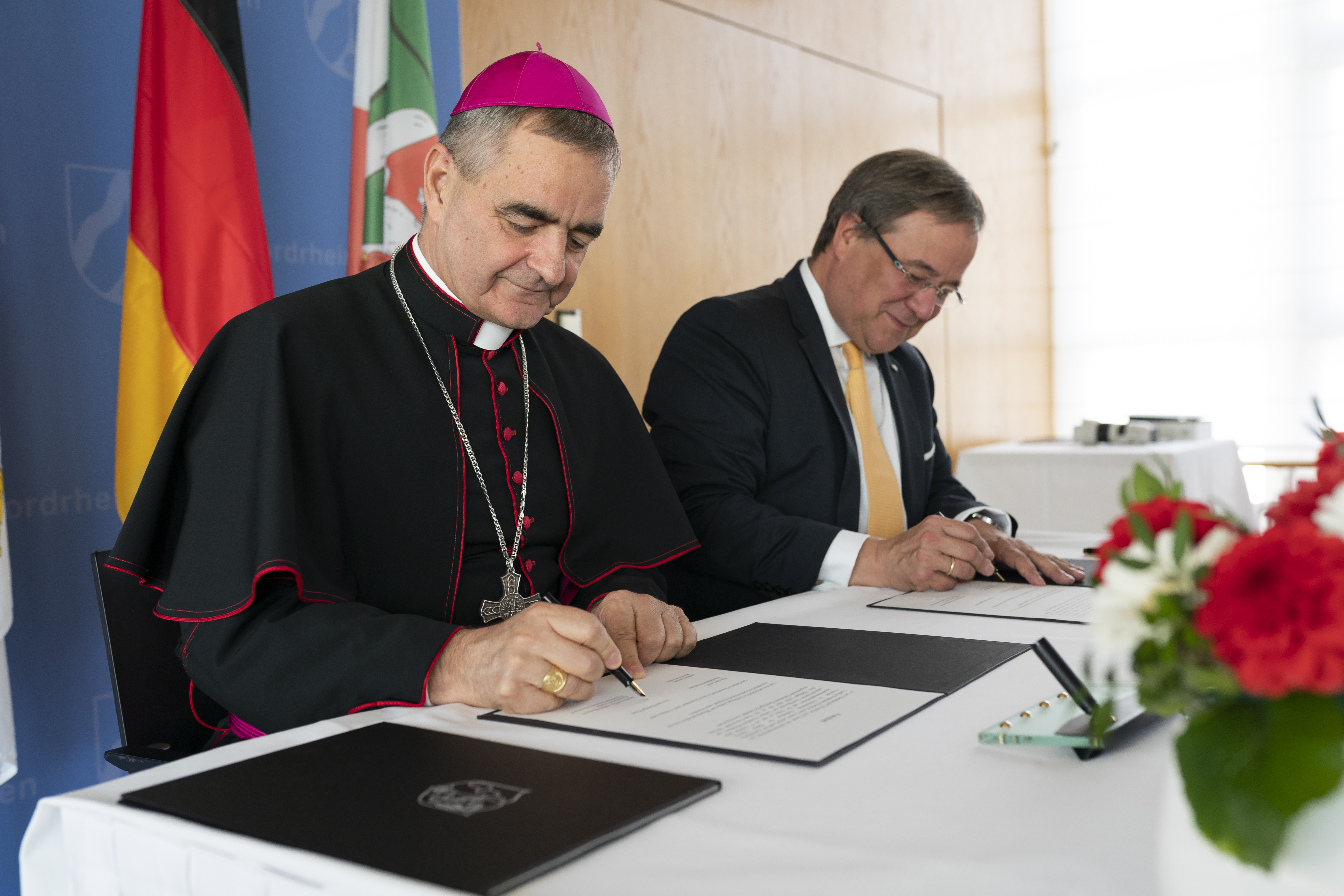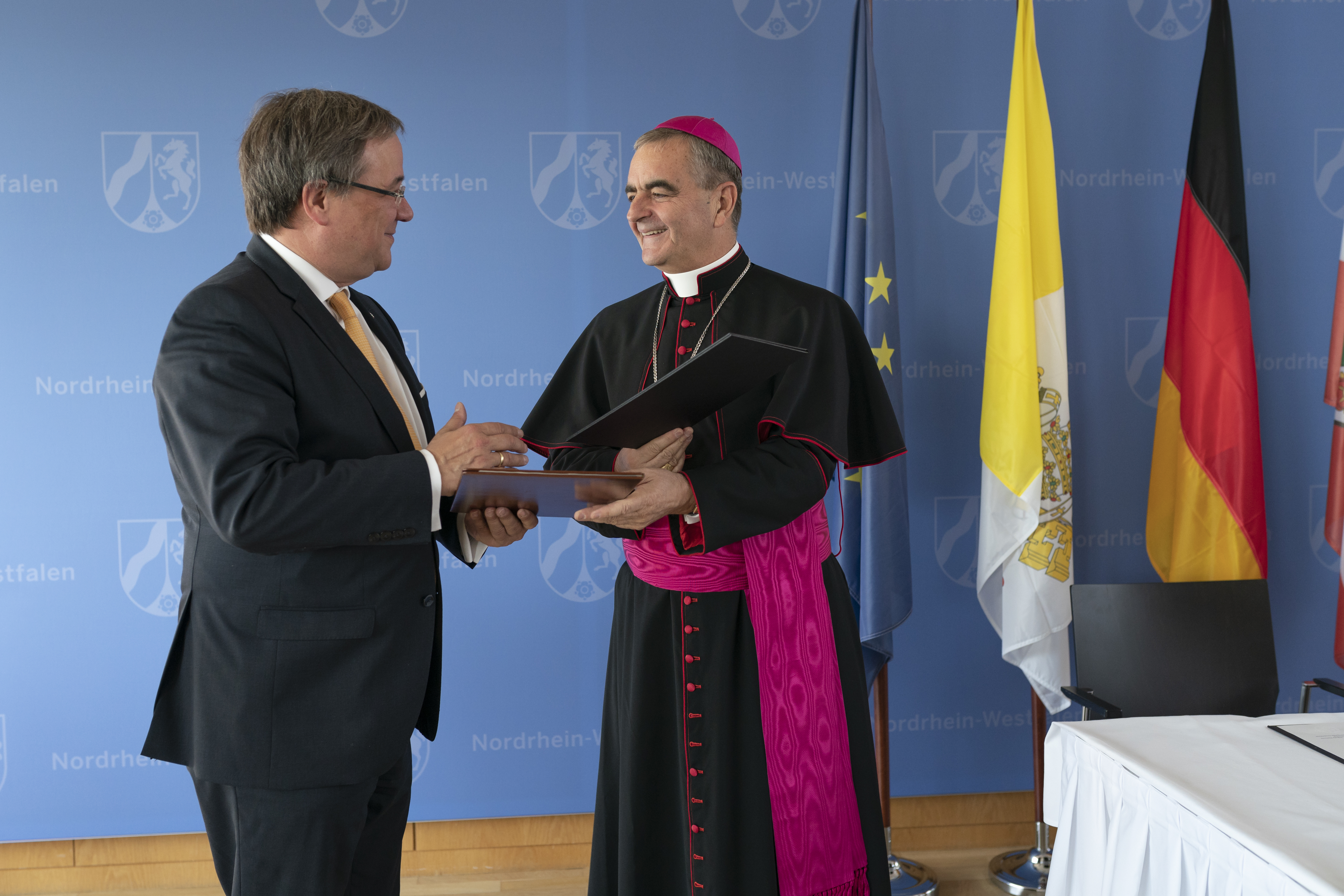 Ministerpräsident Armin Laschet hat am Dienstag Erzbischof Dr. Nikola Eterović, den päpstlichen Nuntius in Deutschland, in der Staatskanzlei empfangen. Beide Seiten unterzeichneten diplomatische Noten, durch die sich sowohl der Heilige Stuhl als auch das Land Nordrhein-Westfalen für die weitere Förderung Katholischer Theologie am Standort Bochum aussprechen.