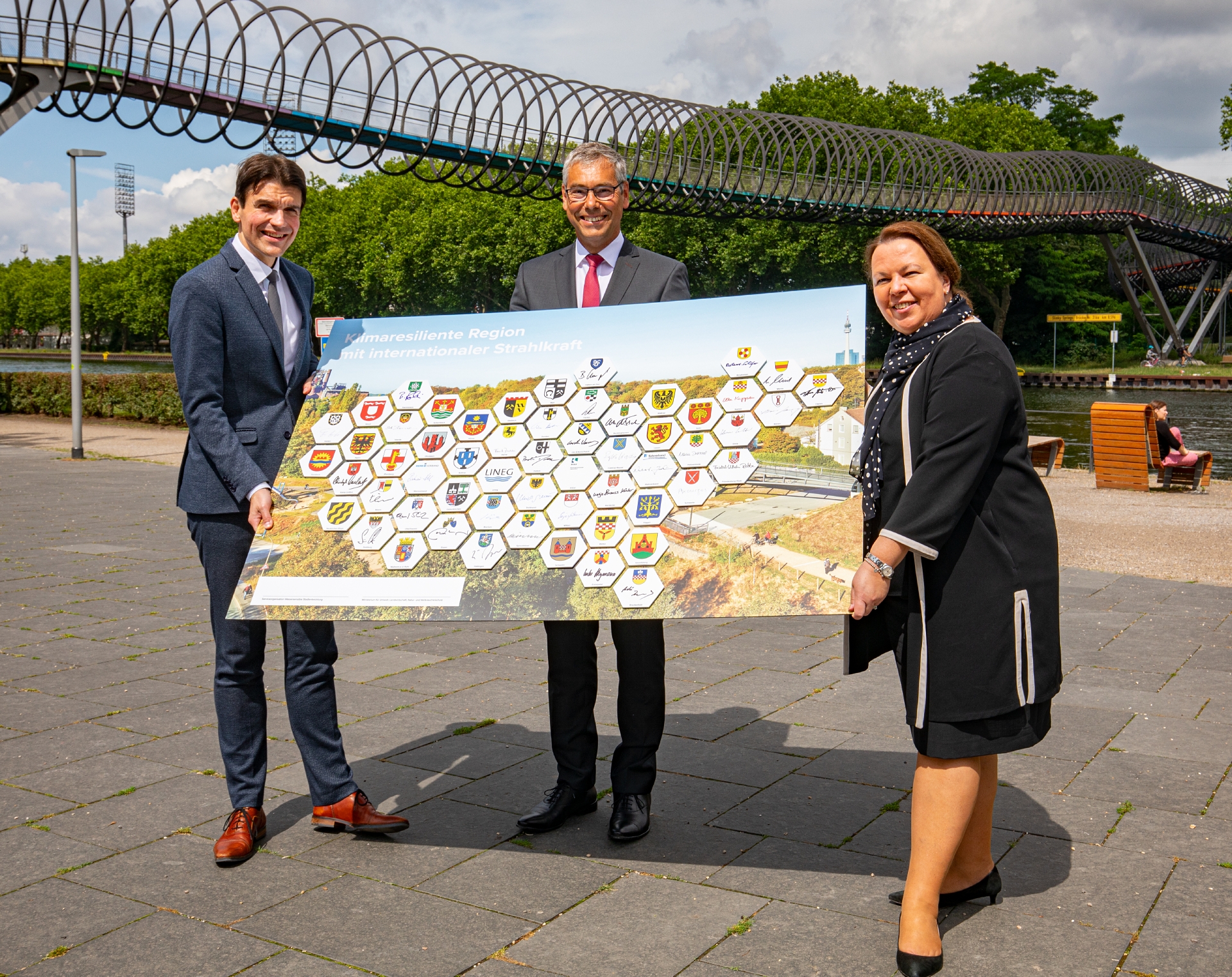 Als deutliches Bekenntnis zur Klimafolgenanpassung unterzeichneten Umweltministerin Ursula Heinen-Esser und die Vorstandsvorsitzenden der großen Wasserwirtschaftsverbände Emschergenossenschaft, Lippeverband und Ruhrverband – Prof. Dr. Uli Paetzel und Prof. Dr. Norbert Jardin – nun in Oberhausen eine symbolische Erklärung. Alle Städte der Region werden auf dieser Erklärung vertreten sein, sowohl die kreisfreien Städte Bochum, Bottrop, Dortmund, Duisburg, Essen, Gelsenkirchen, Hagen, Hamm, Herne, Mülheim an der Ruhr und Oberhausen als auch die Kreise Ennepe-Ruhr, Recklinghausen, Unna und Wesel. Neben der Emschergenossenschaft als federführender Wasserwirtschaftsverband sind darüber hinaus nun auch der Lippeverband, der Ruhrverband, die Linksniederrheinische Entwässerungs-Genossenschaft und der Niersverband dabei.