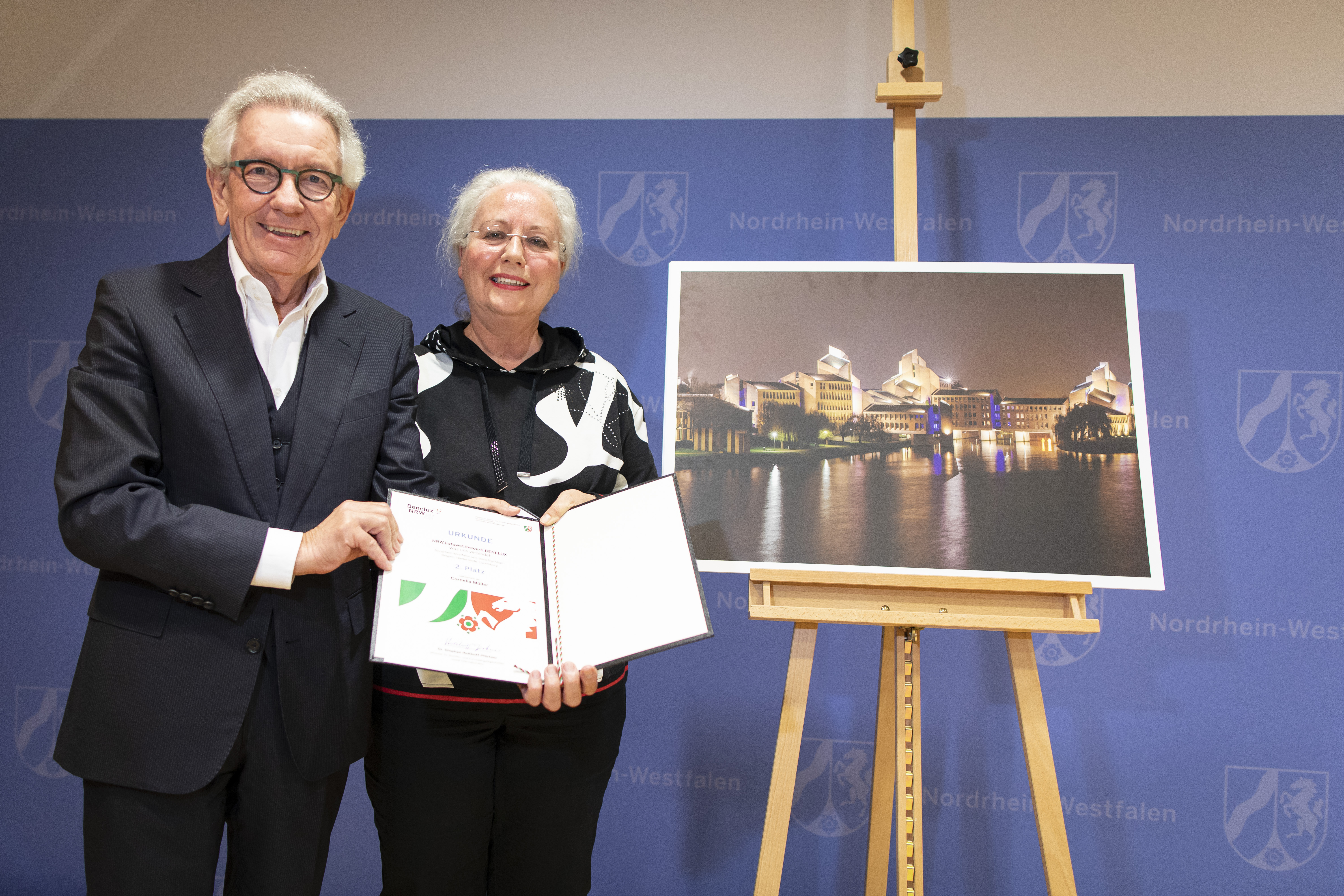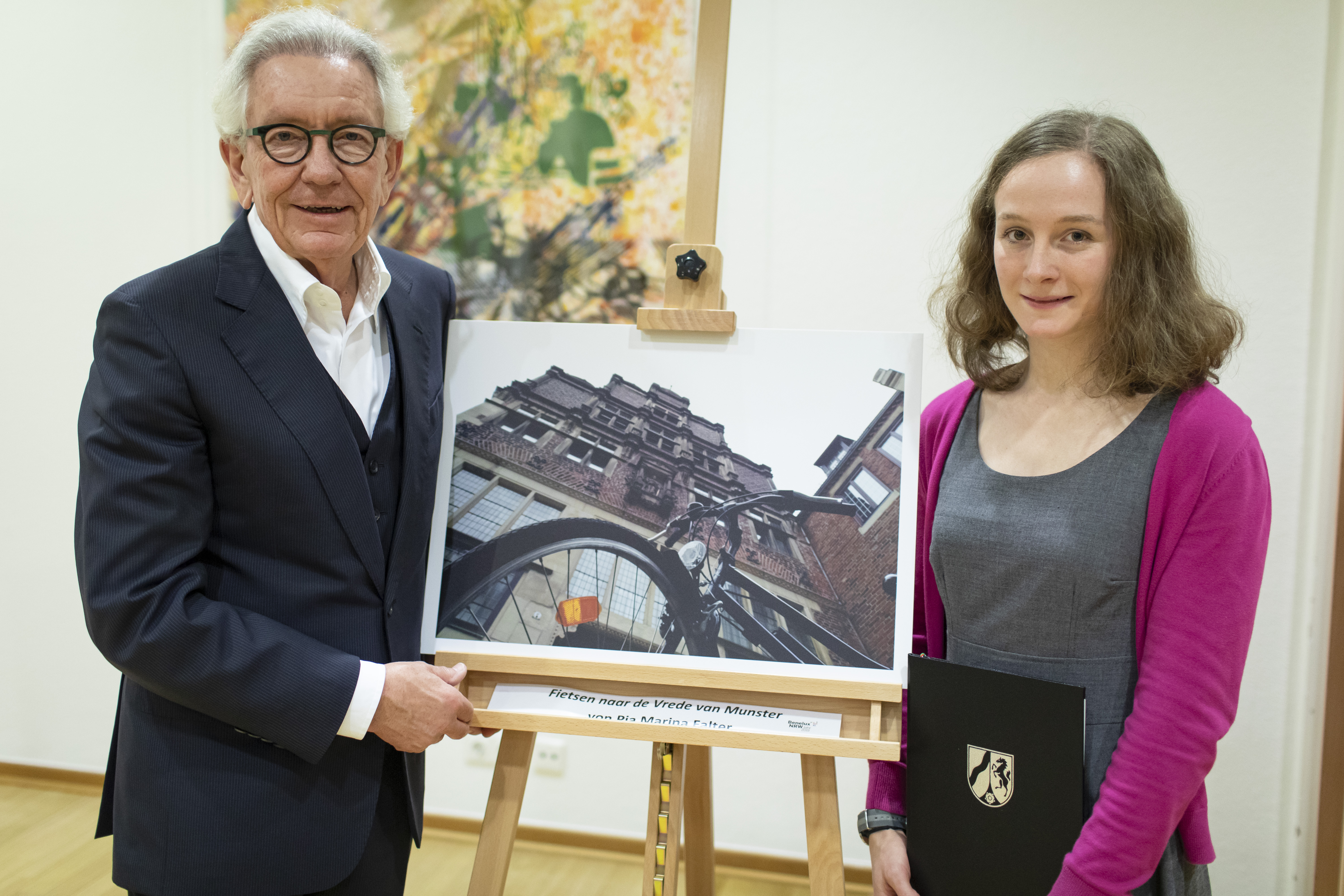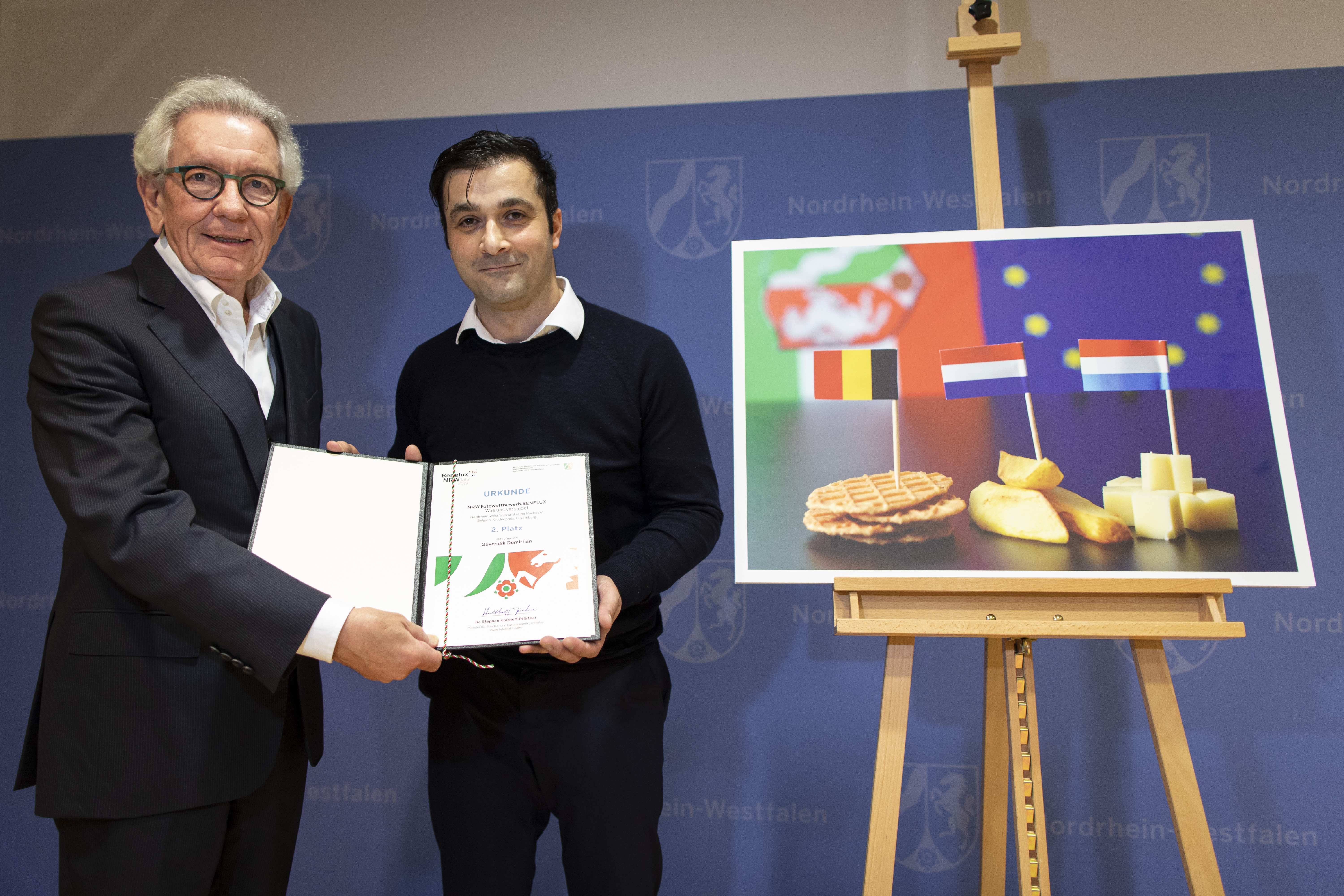 Europaminister Stephan Holthoff-Pförtner hat die Sieger des Fotowettbewerbs zum Beneluxjahr in der Staatskanzlei ausgezeichnet.