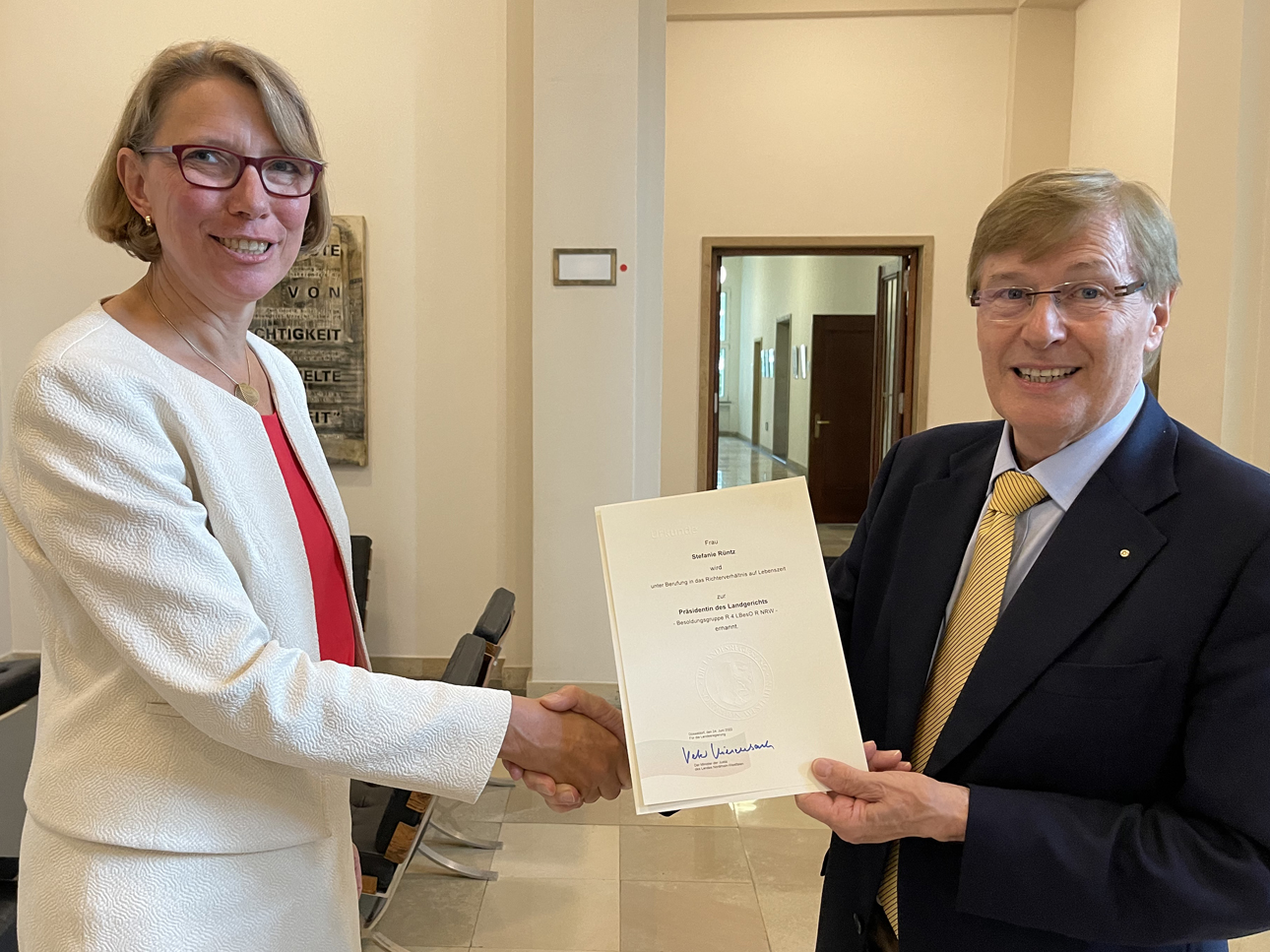 Stefanie Rüntz ist die neue Präsidentin des Landgerichts Krefeld. Minister der Justiz Peter Biesenbach hat der 53-jährigen Juristin am 24. Juni 2022 in Düsseldorf die Ernennungsurkunde ausgehändigt. Präsidentin des Landgerichts Stefanie Rüntz ist Nachfolgerin von Dr. Dietmar Dumke, der seit Januar 2022 das Amtsgericht Köln leitet.
