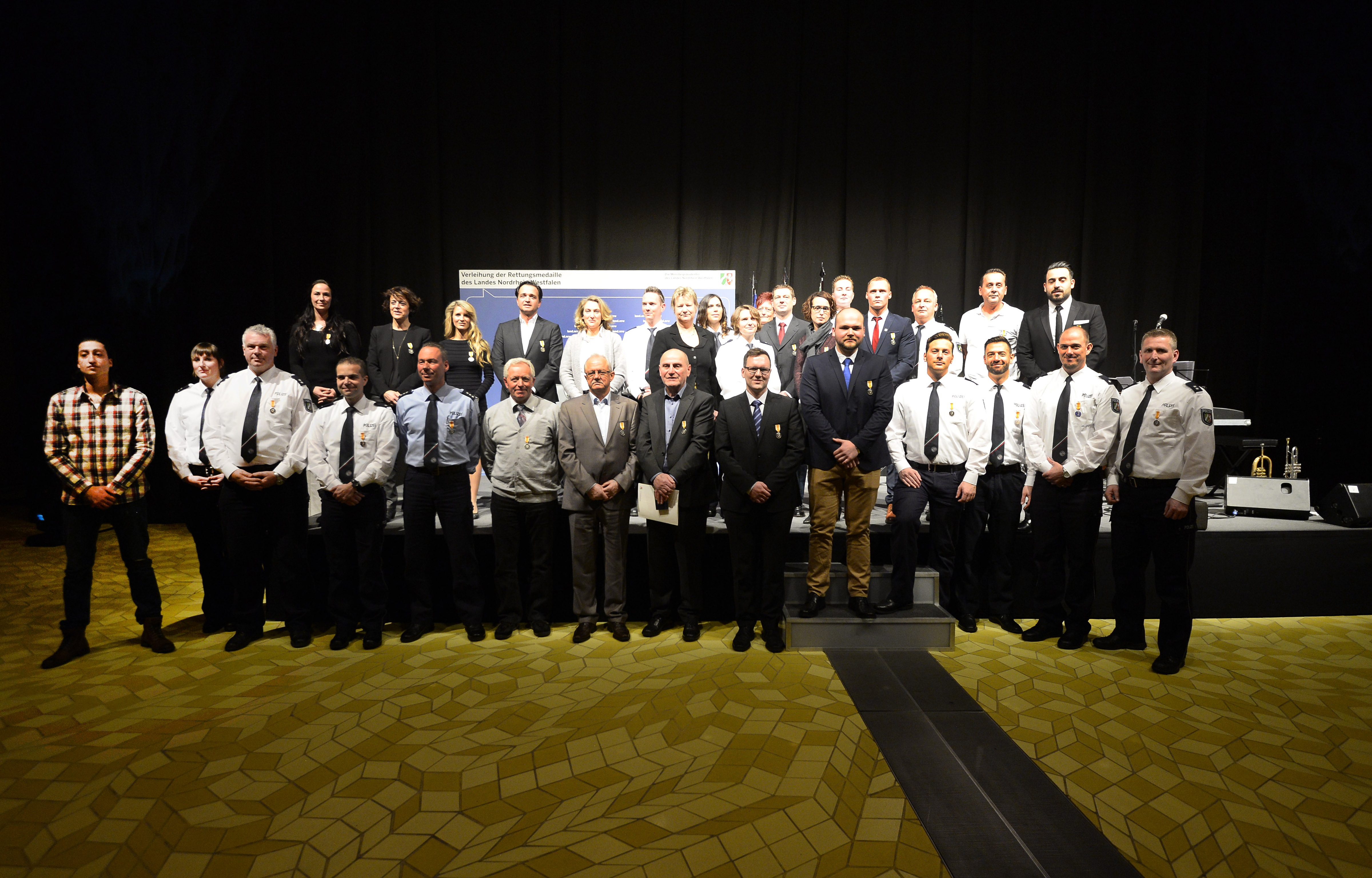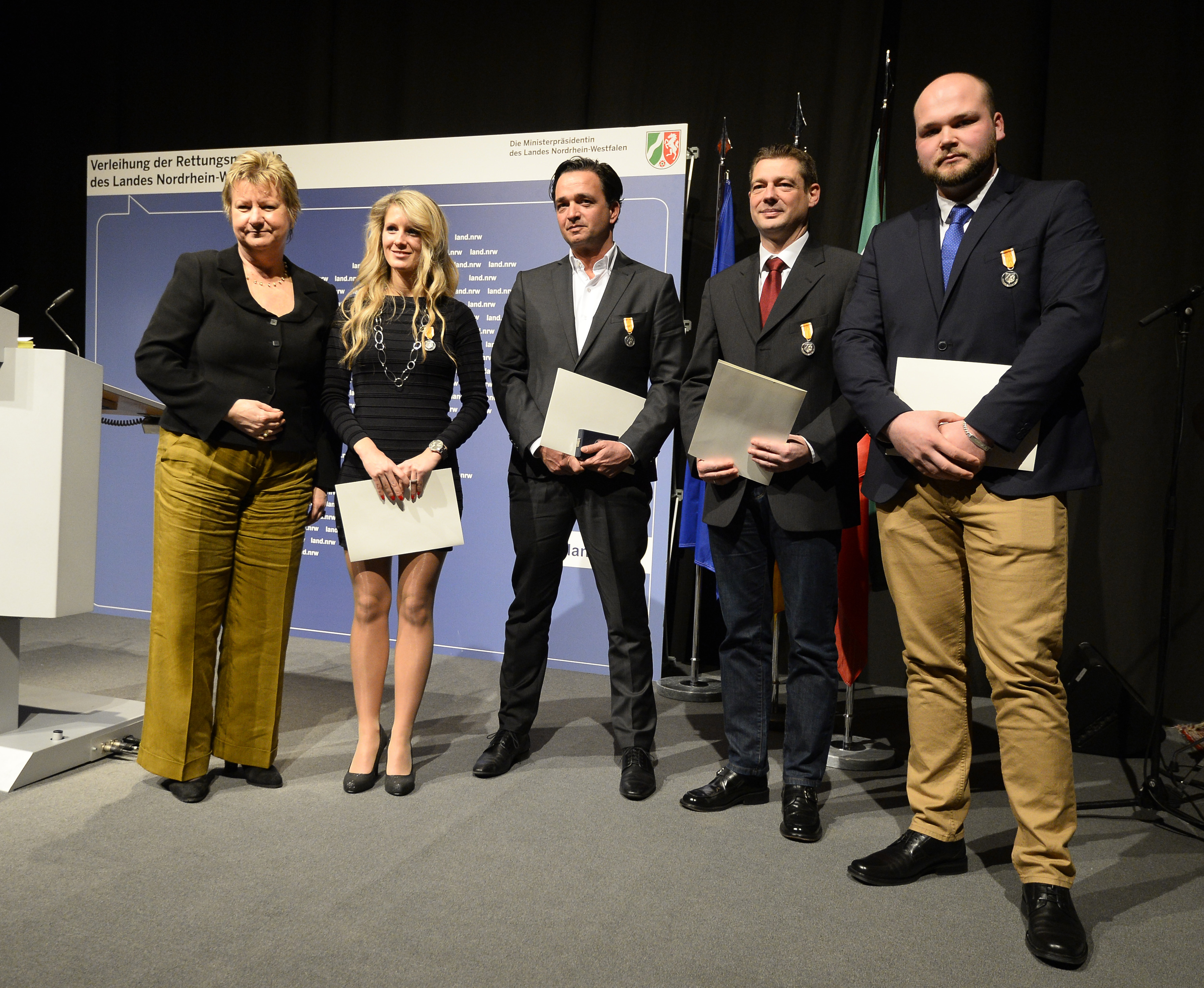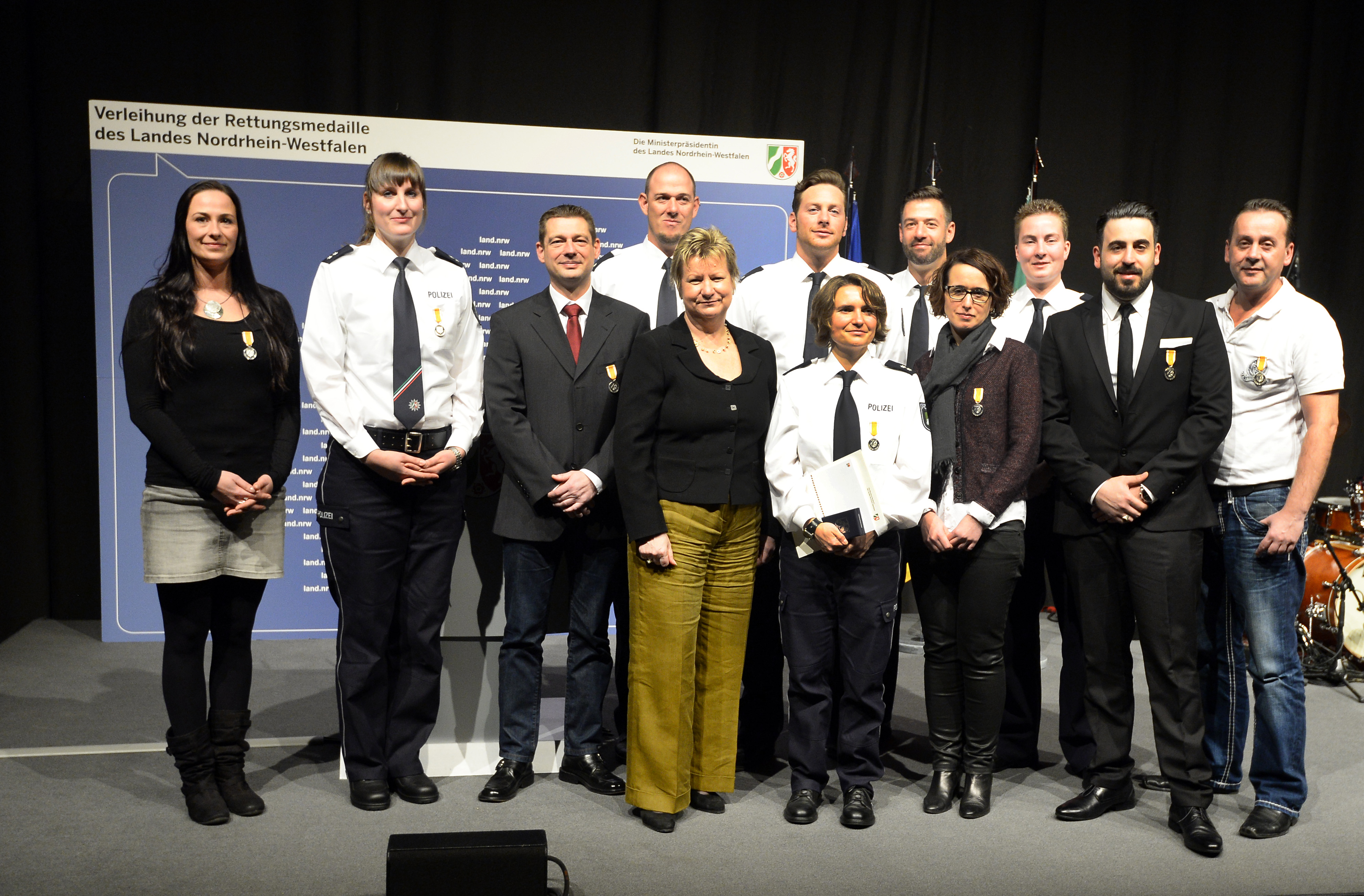 Die Stellvertretende Ministerpräsidentin Sylvia Löhrmann hat in Vertretung für Ministerpräsidentin Hannelore Kraft 31 Retterinnen und Retter mit der Rettungsmedaille des Landes Nordrhein-Westfalen ausgezeichnet. In einer Feierstunde in der Turbinenhalle in Düsseldorf dankte die Stellvertretende Ministerpräsidentin den Retterinnen und Rettern für ihren selbstlosen Einsatz: „Sie haben in Situationen, in die Sie unversehens hineingeraten sind, außergewöhnlichen Mut gezeigt und unter Gefahr für Ihr eigenes Leben das anderer Menschen gerettet. Sie haben ganz instinktiv, ohne lange zu überlegen, gehandelt und das Richtige getan. Sie haben im entscheidenden Moment nicht gezögert. Sie sind Vorbilder für uns alle, Sie sind wirkliche Heldinnen und Helden!”