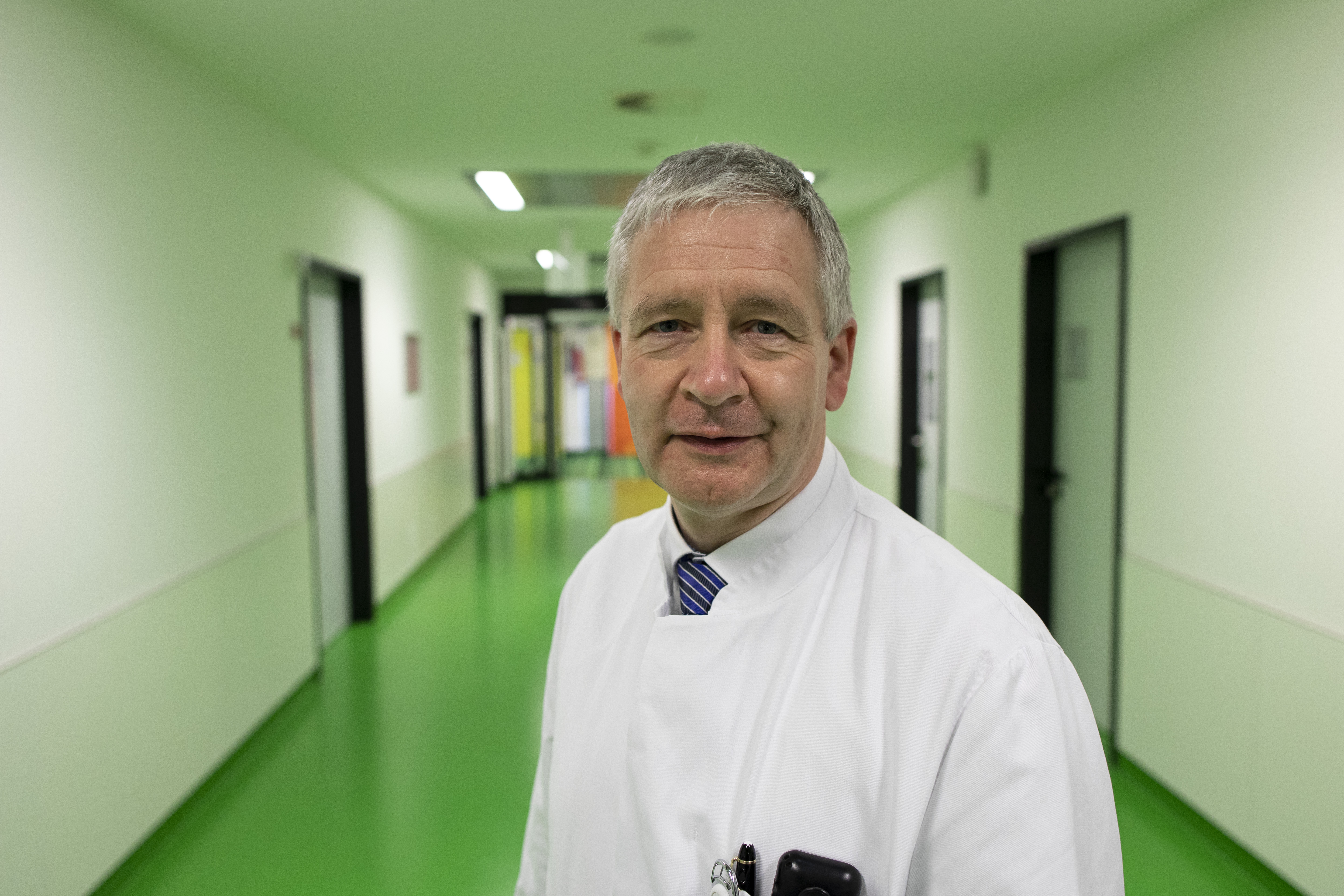 Klinikdirektor Prof. Gernot Marx demonstrierte dem Ministerpräsidenten die Funktionsweise des Virtuellen Krankenhauses mit einer Live-Visite ins Krankenhaus St. Marienhospital in Düren und ins Städtische Krankenhaus in Düren.
