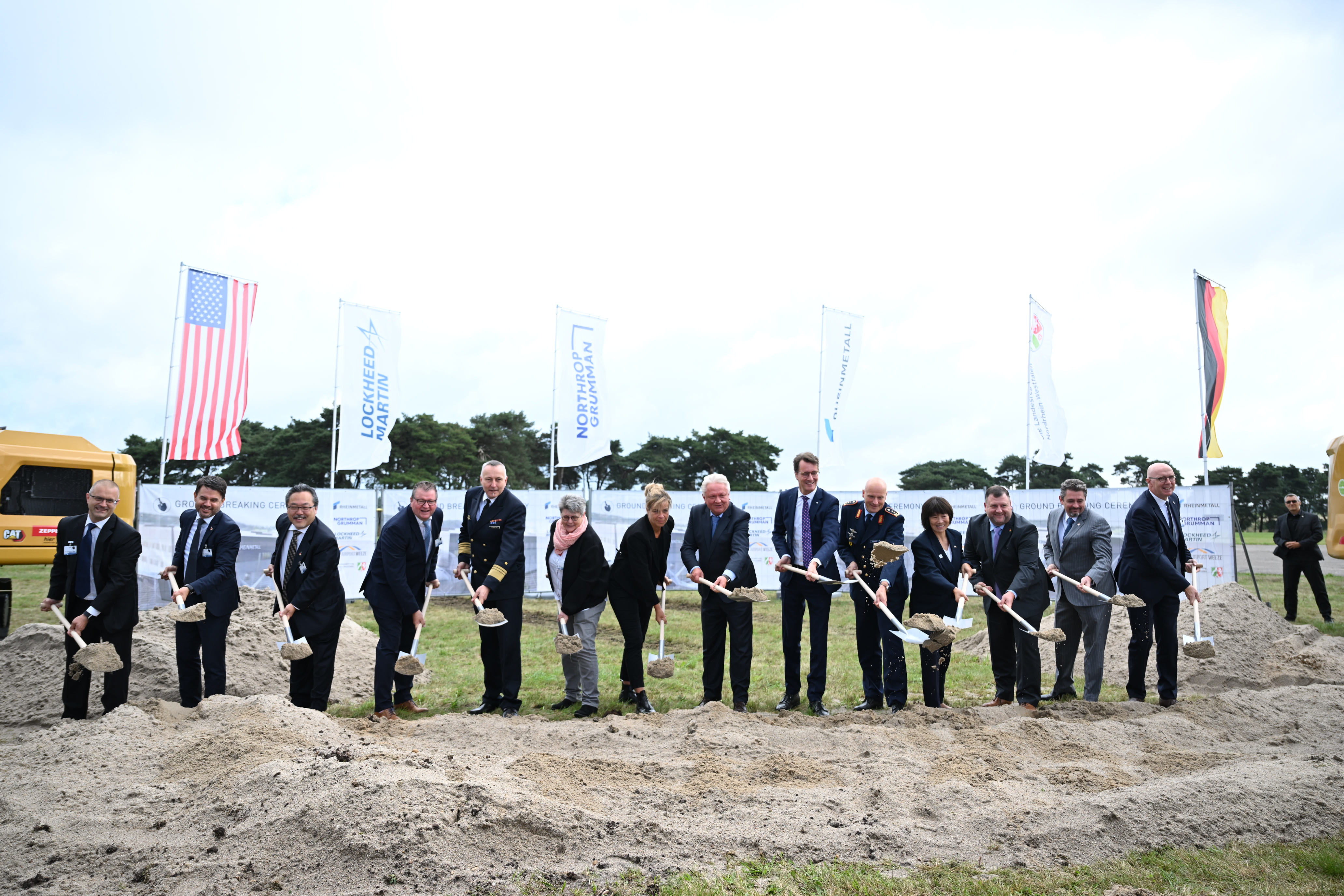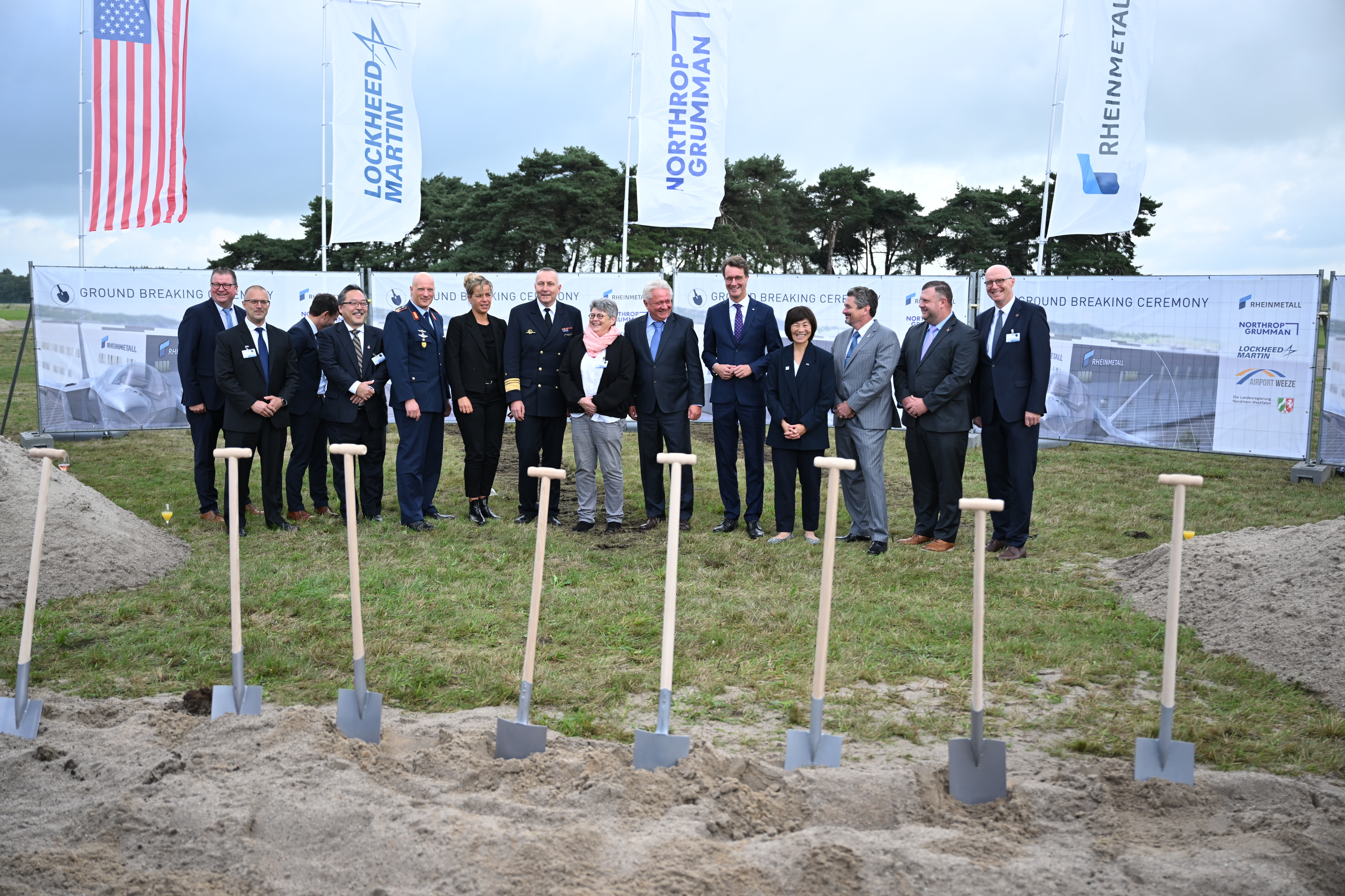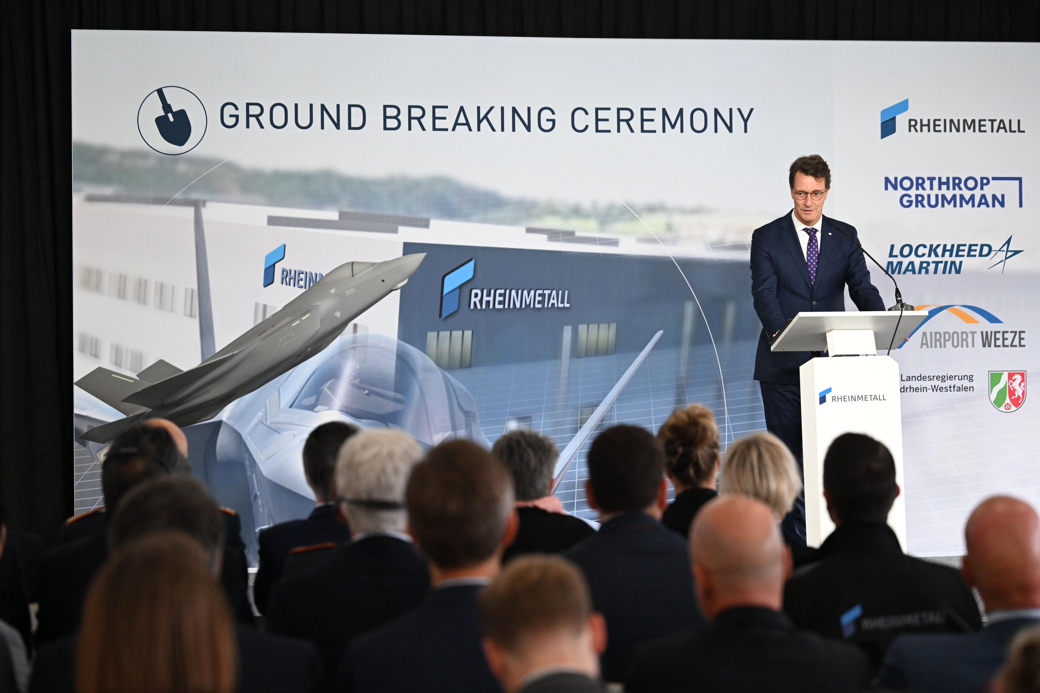 Den Auftakt des Tages bildet der symbolische erste Spatenstich für eine neue hochmoderne Fabrik von Rheinmetall in Weeze. Auf einer Fläche von rund 60.000 Quadratmetern wird hier ein Werk zur Fertigung von Rumpfmittelteilen des derzeit leistungsfähigsten Kampfflugzeugs der Welt, dem F-35A Lightning II, entstehen.