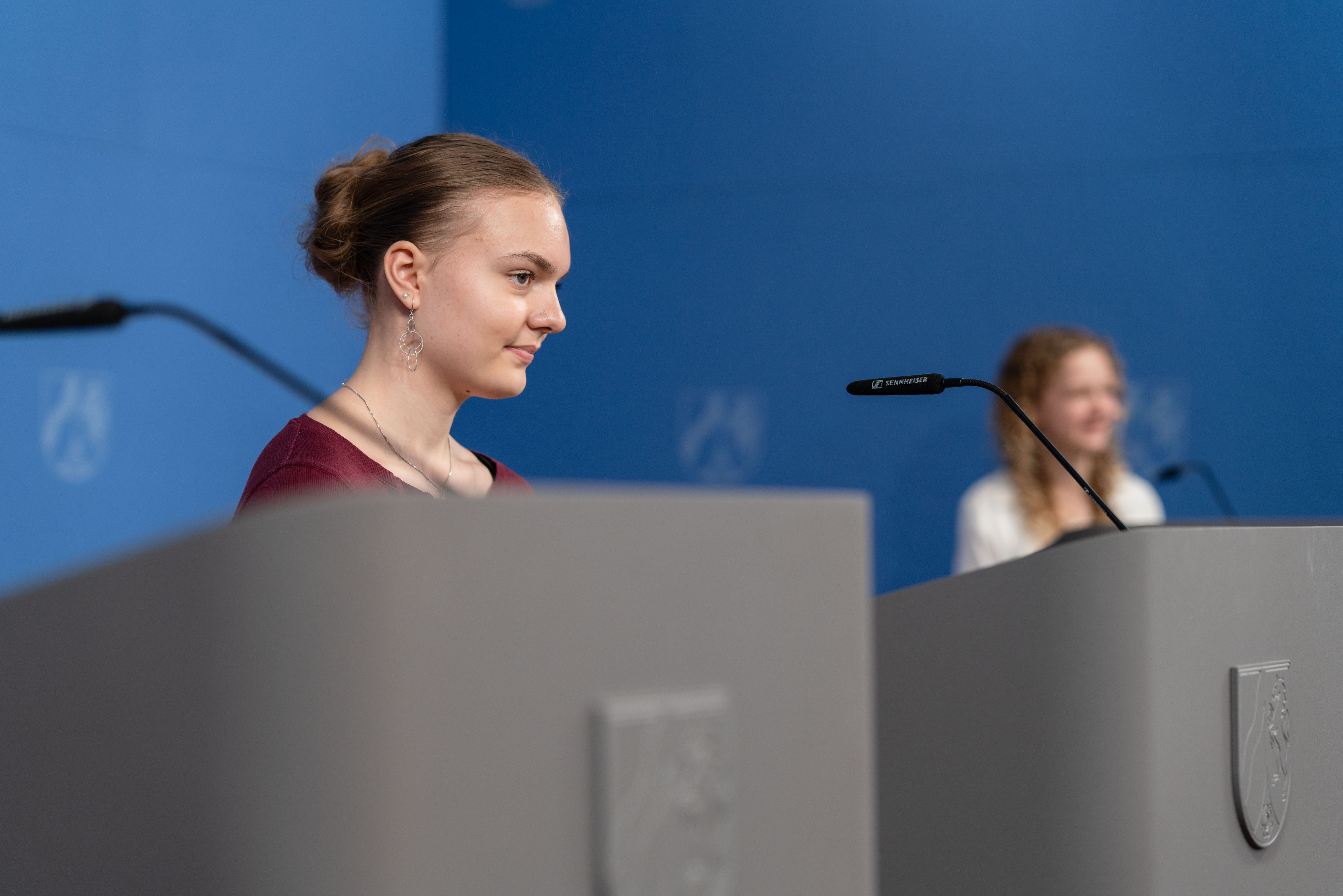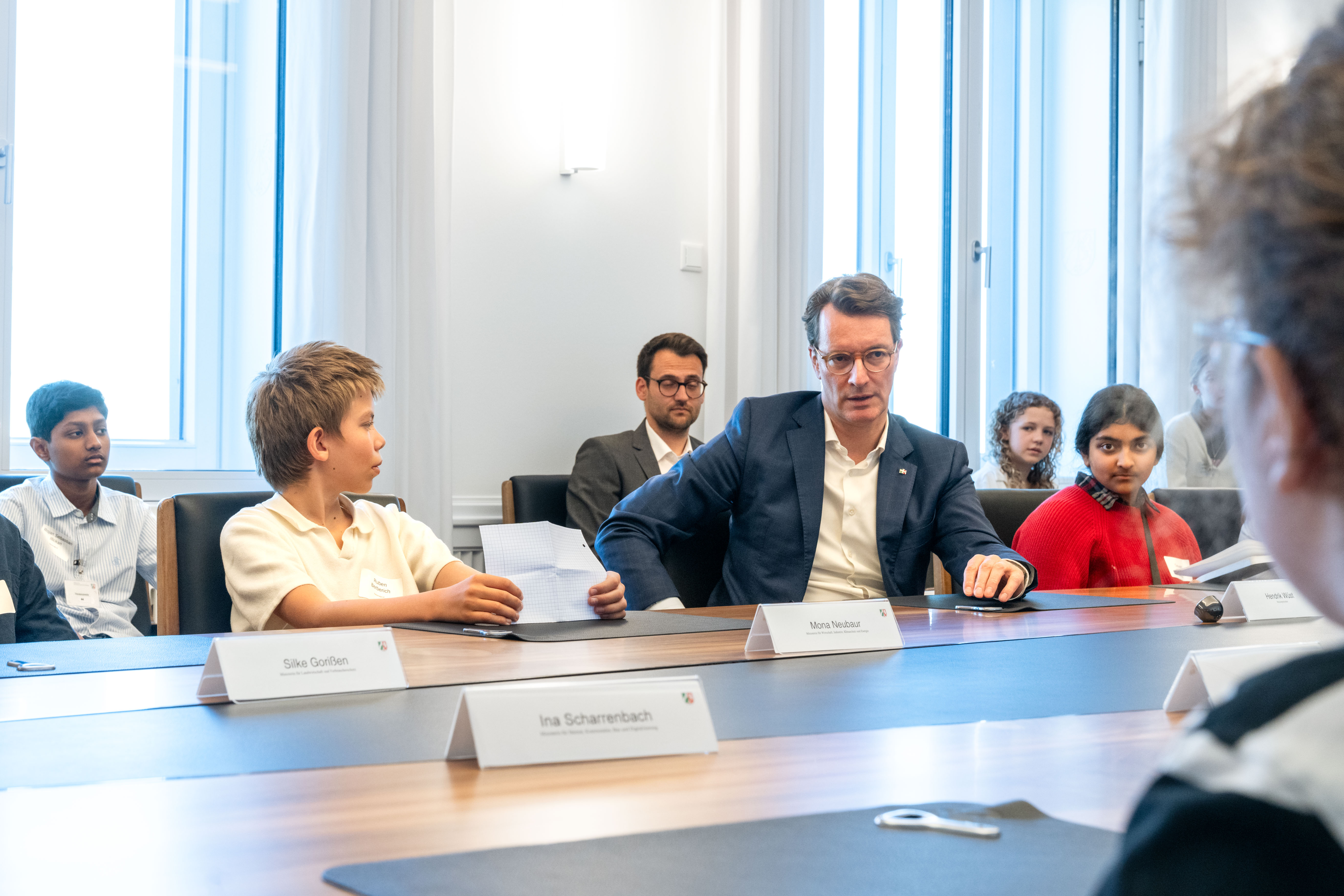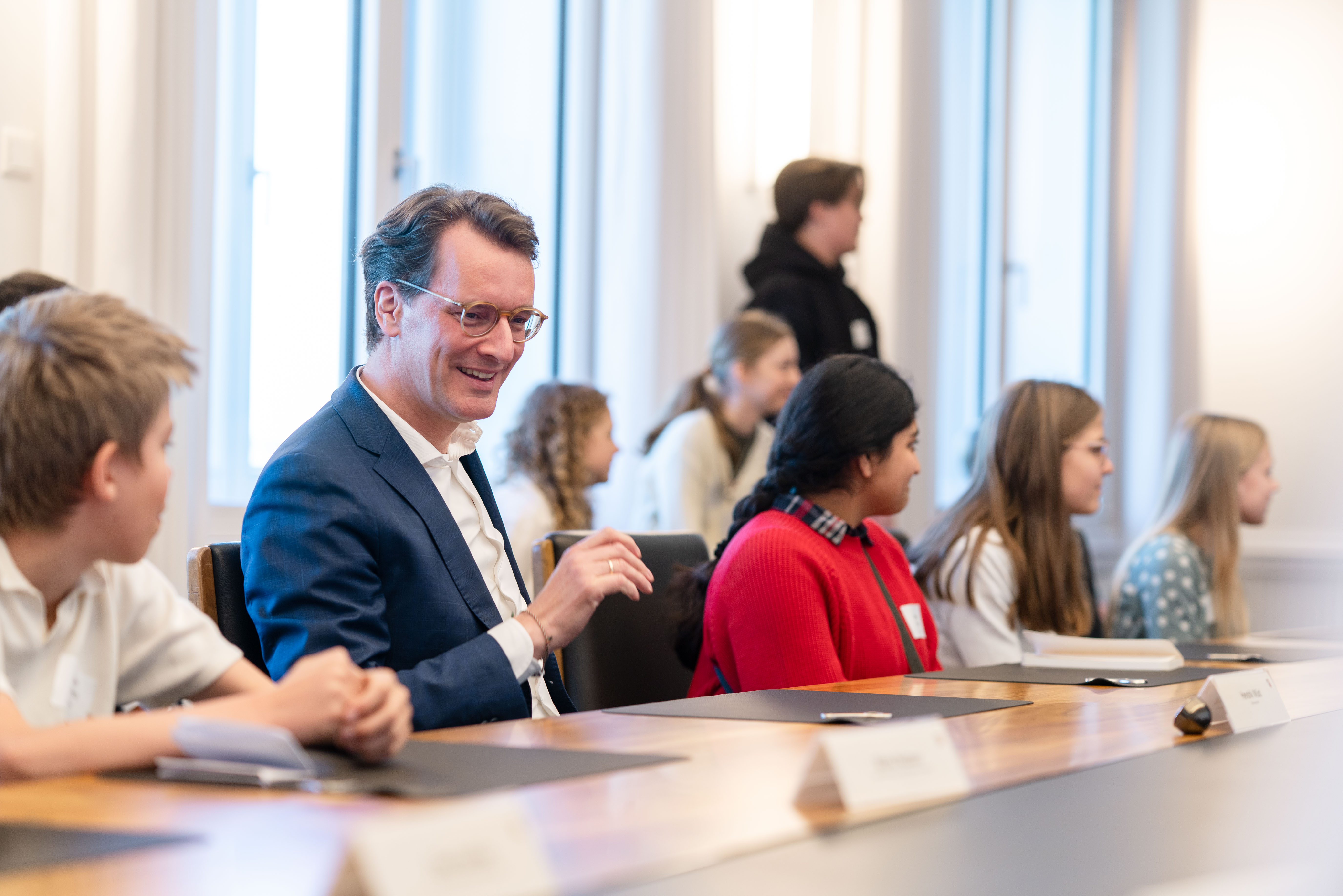 Ministerpräsident Hendrik Wüst beantwortete im Kabinettsaal Fragen der Schülerinnen und Schüler zu seiner eigenen Arbeit und zur Landesregierung. Danach erhielten die Jungen und Mädchen in Praxis-Workshops Einblicke in unterschiedliche Tätigkeitsfelder der Staatskanzlei: Je nach Workshop schrieben sie Reden, probierten sich in der Regierungskommunikation aus und tauchten in die Wissensvermittlung ein. Andere Jugendliche bekamen Einblicke in die hauseigene IT und die Personalverwaltung.