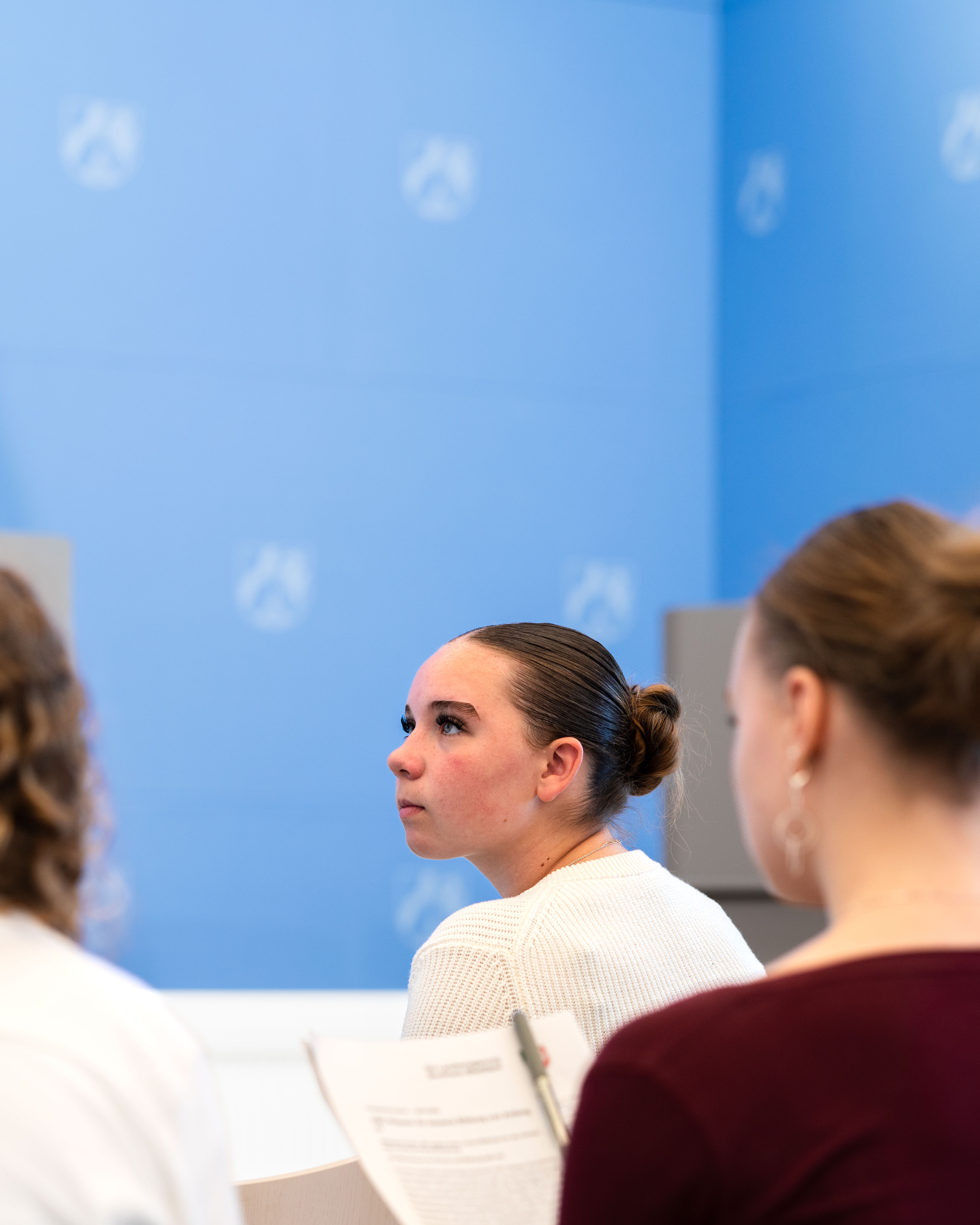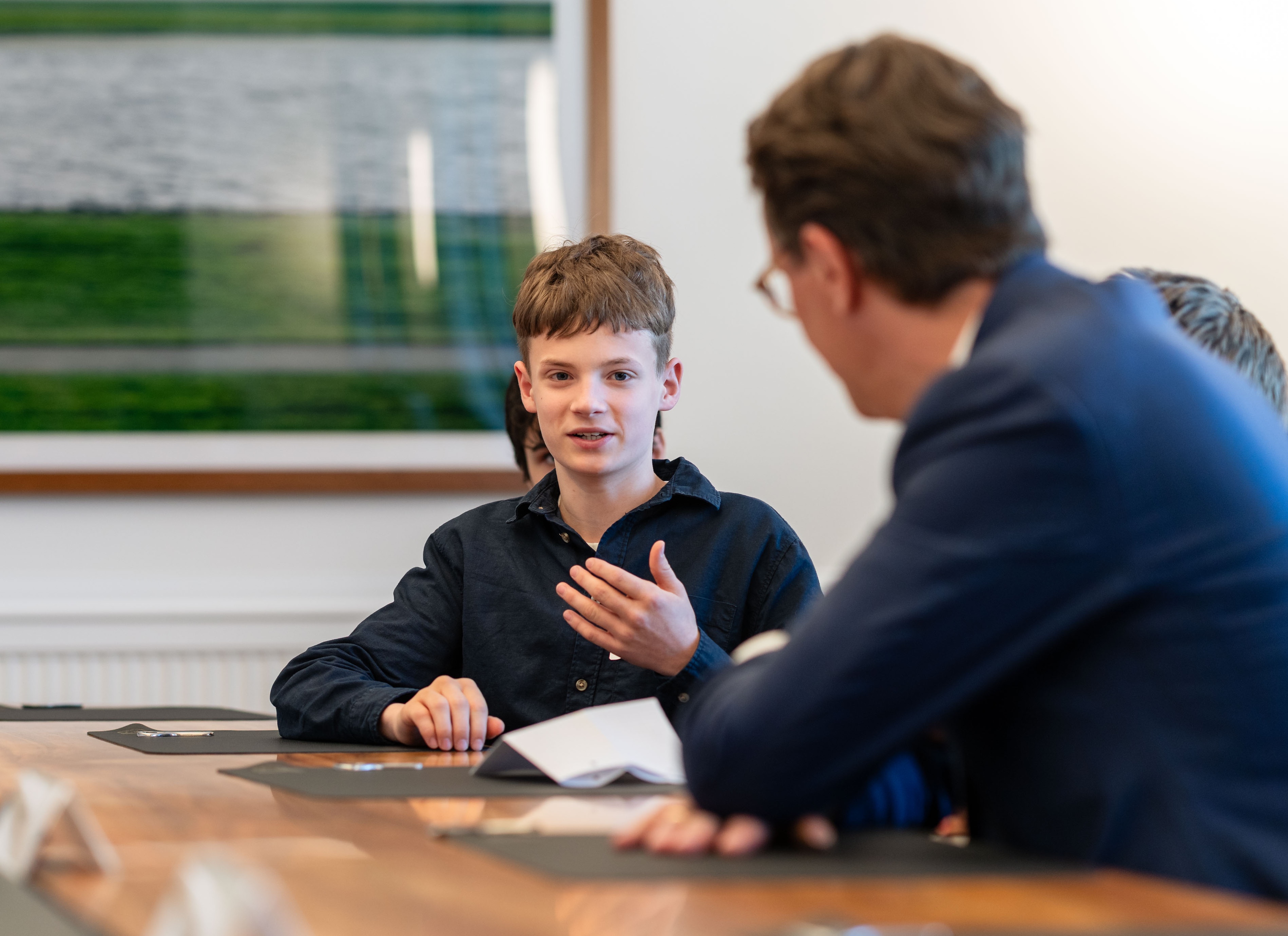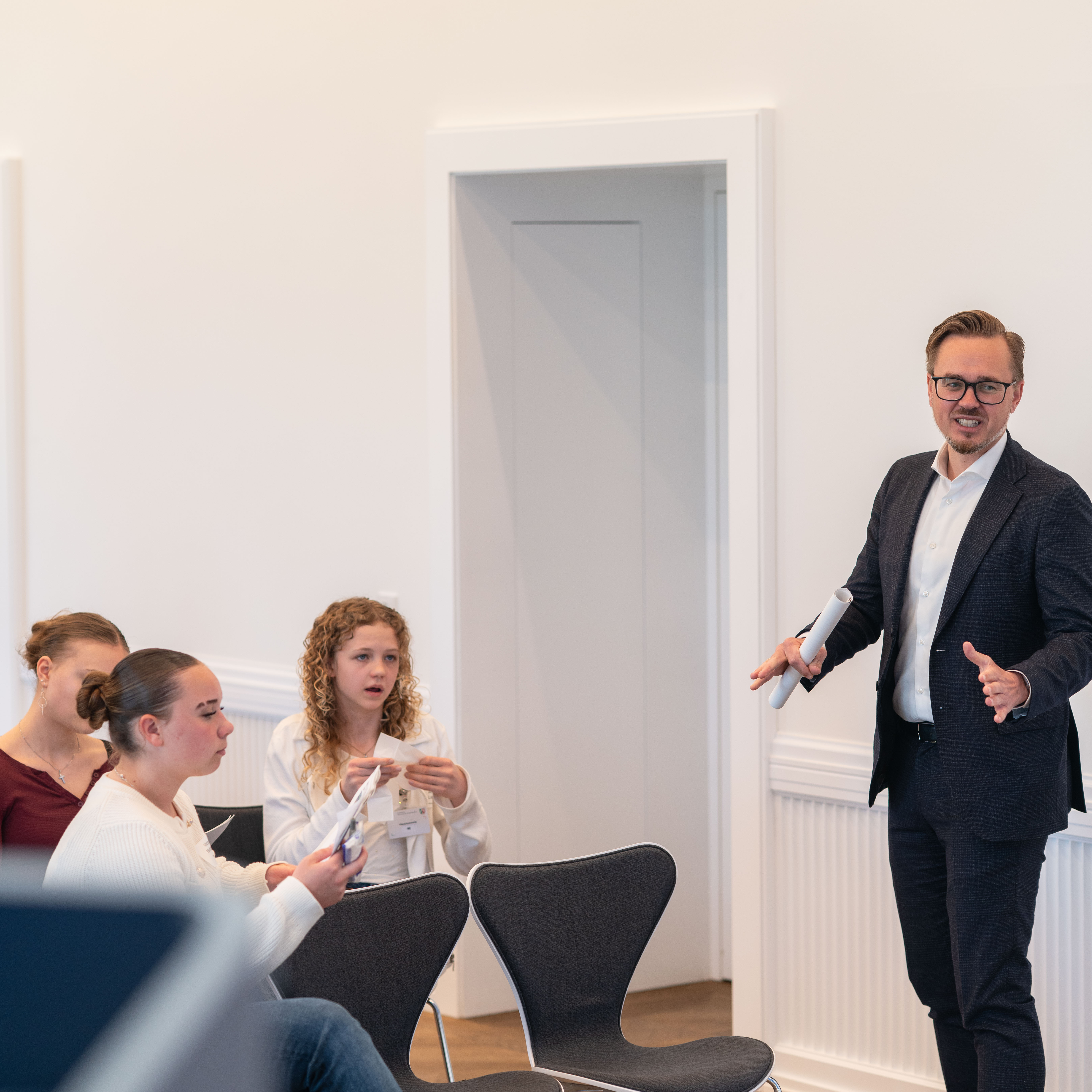 Ministerpräsident Hendrik Wüst beantwortete im Kabinettsaal Fragen der Schülerinnen und Schüler zu seiner eigenen Arbeit und zur Landesregierung. Danach erhielten die Jungen und Mädchen in Praxis-Workshops Einblicke in unterschiedliche Tätigkeitsfelder der Staatskanzlei: Je nach Workshop schrieben sie Reden, probierten sich in der Regierungskommunikation aus und tauchten in die Wissensvermittlung ein. Andere Jugendliche bekamen Einblicke in die hauseigene IT und die Personalverwaltung.