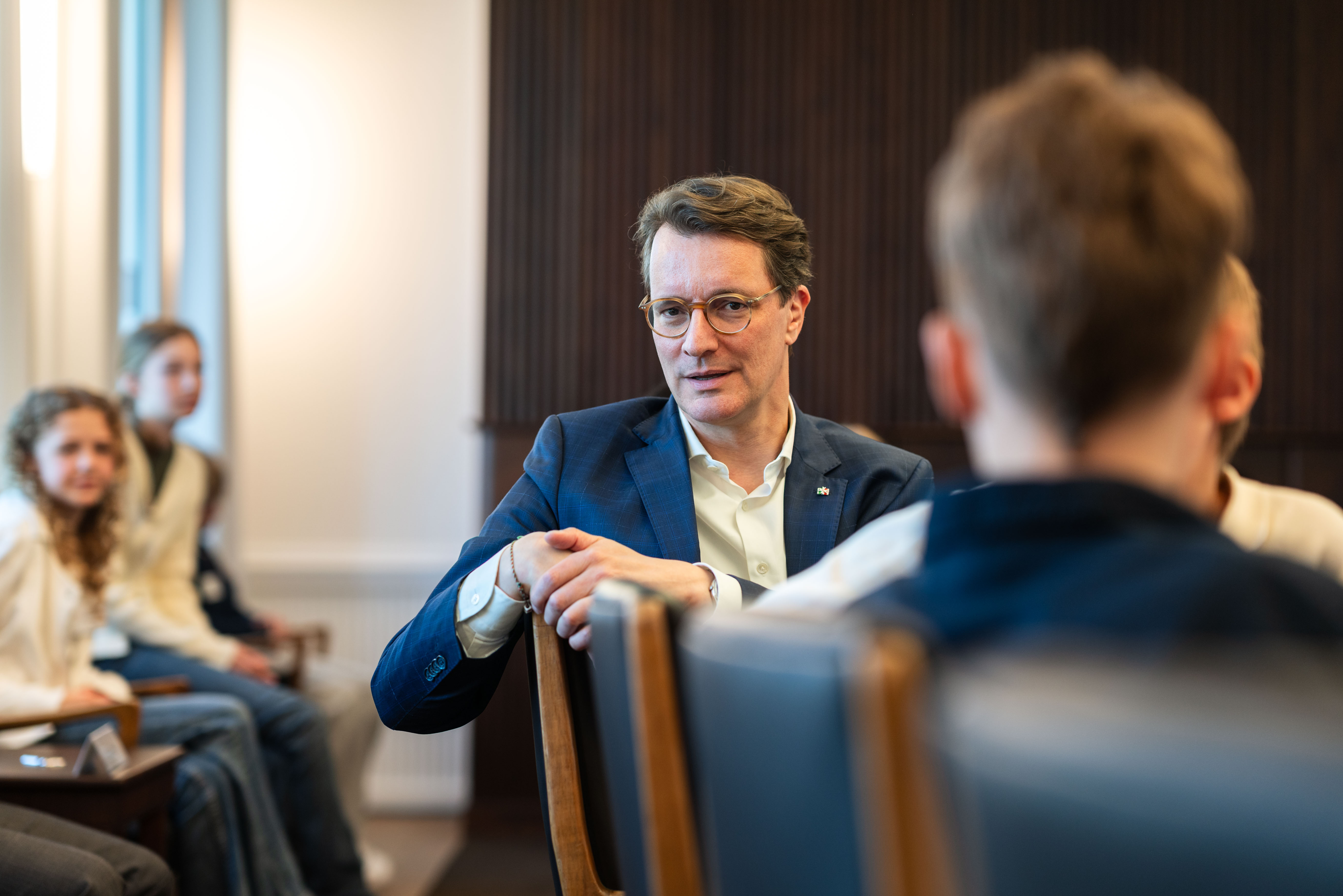 20 Schülerinnen und Schüler haben am Girls’ & Boys’ Day die Staatskanzlei kennengelernt. Ministerpräsident Hendrik Wüst stellte sich im Kabinettsaal ihren Fragen – anschließend gaben Praxis-Workshops Einblicke in Bereiche wie Regierungskommunikation, IT und Personalverwaltung.