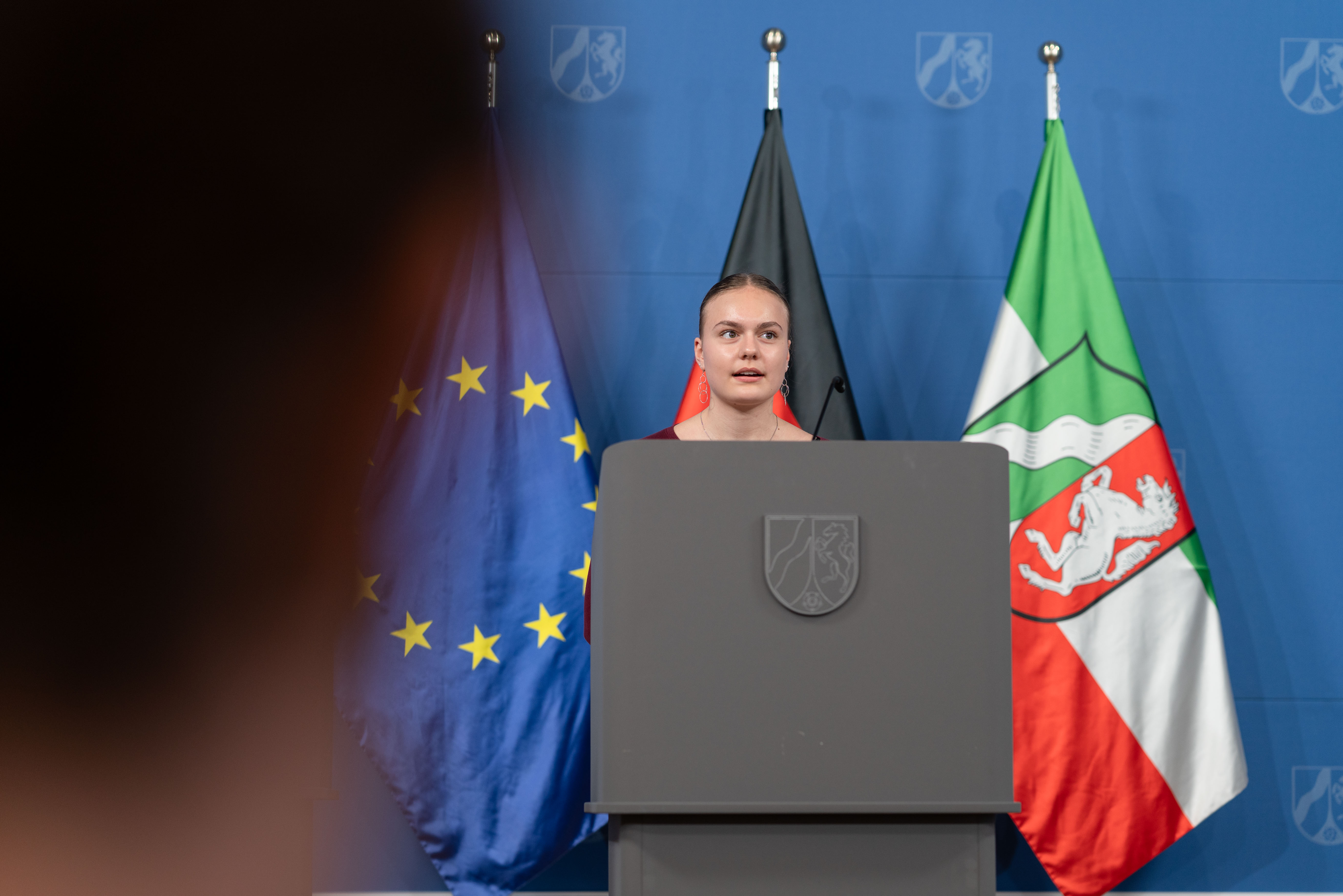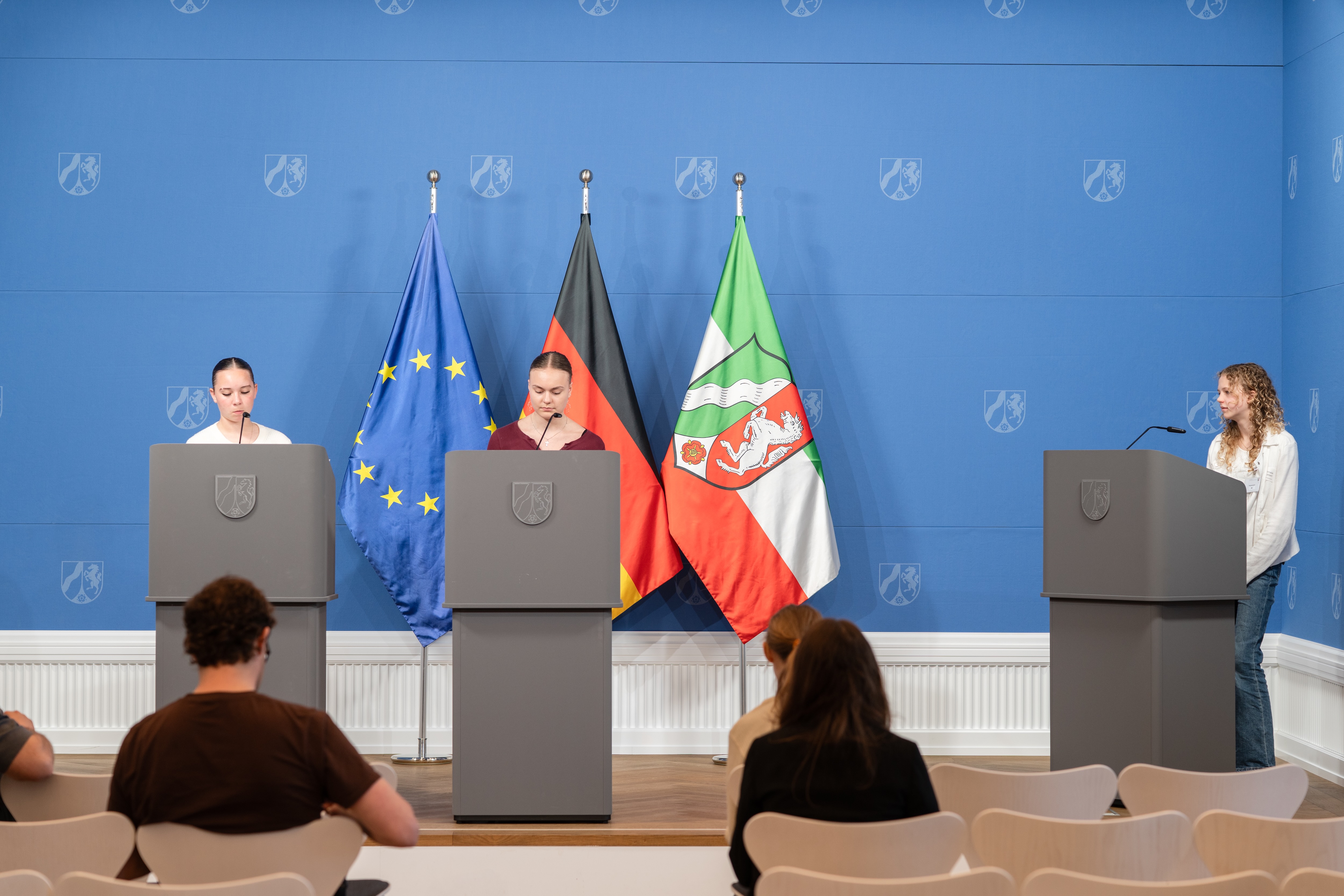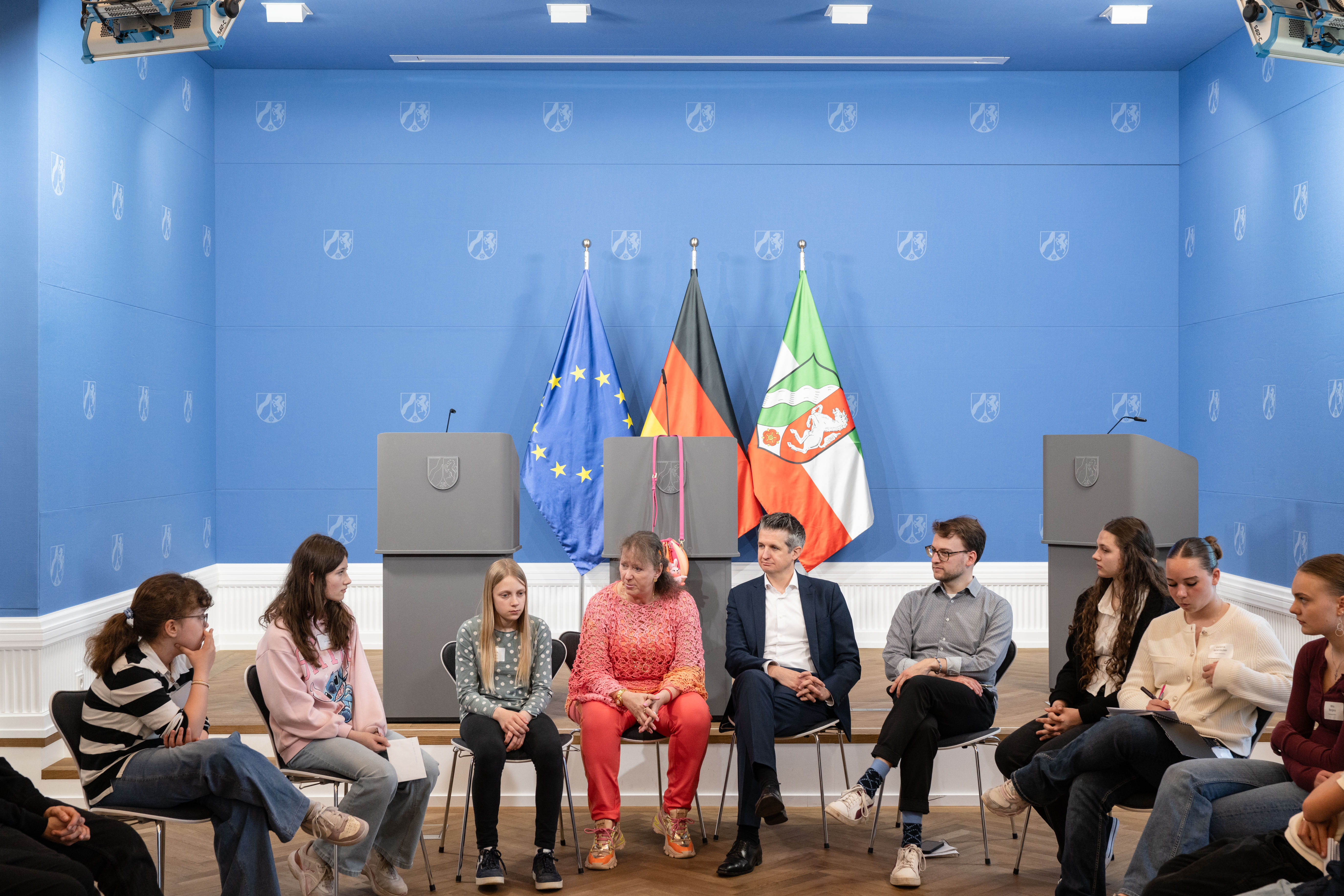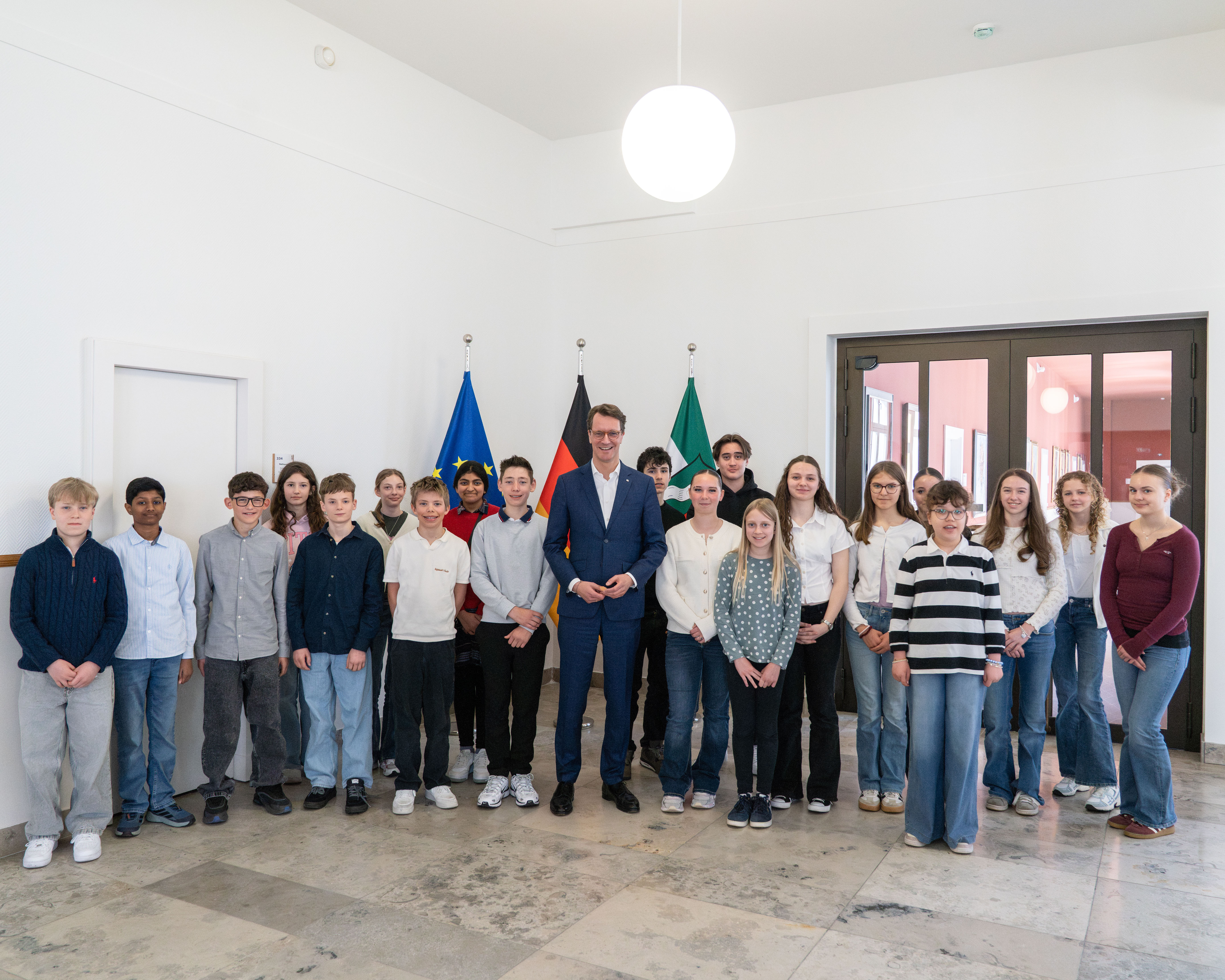 20 Mädchen und Jungen im Alter von 11 bis 15 Jahren haben am Donnerstag, 23. April 2026, am Girls‘ & Boys‘ Day in der Staatskanzlei des Landes Nordrhein-Westfalen in Düsseldorf teilgenommen. Der Aktionstag ermutigt jedes Jahr Mädchen und Jungen ab der 5. Klasse, ihre Berufswahl nach eigenen Erfahrungen, Interessen und Fähigkeiten zu richten – unabhängig von Geschlechterstereotypen in der Berufswelt.