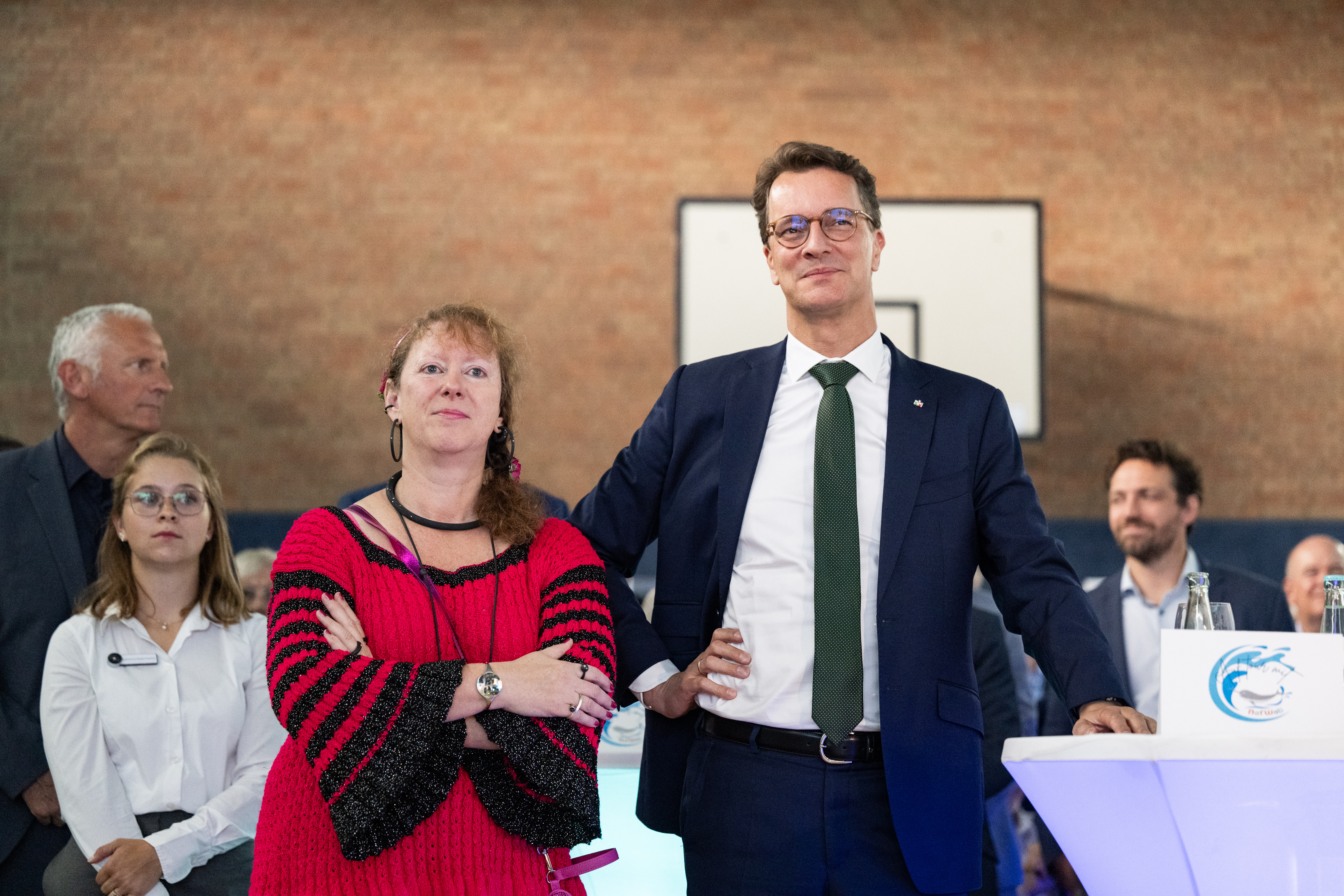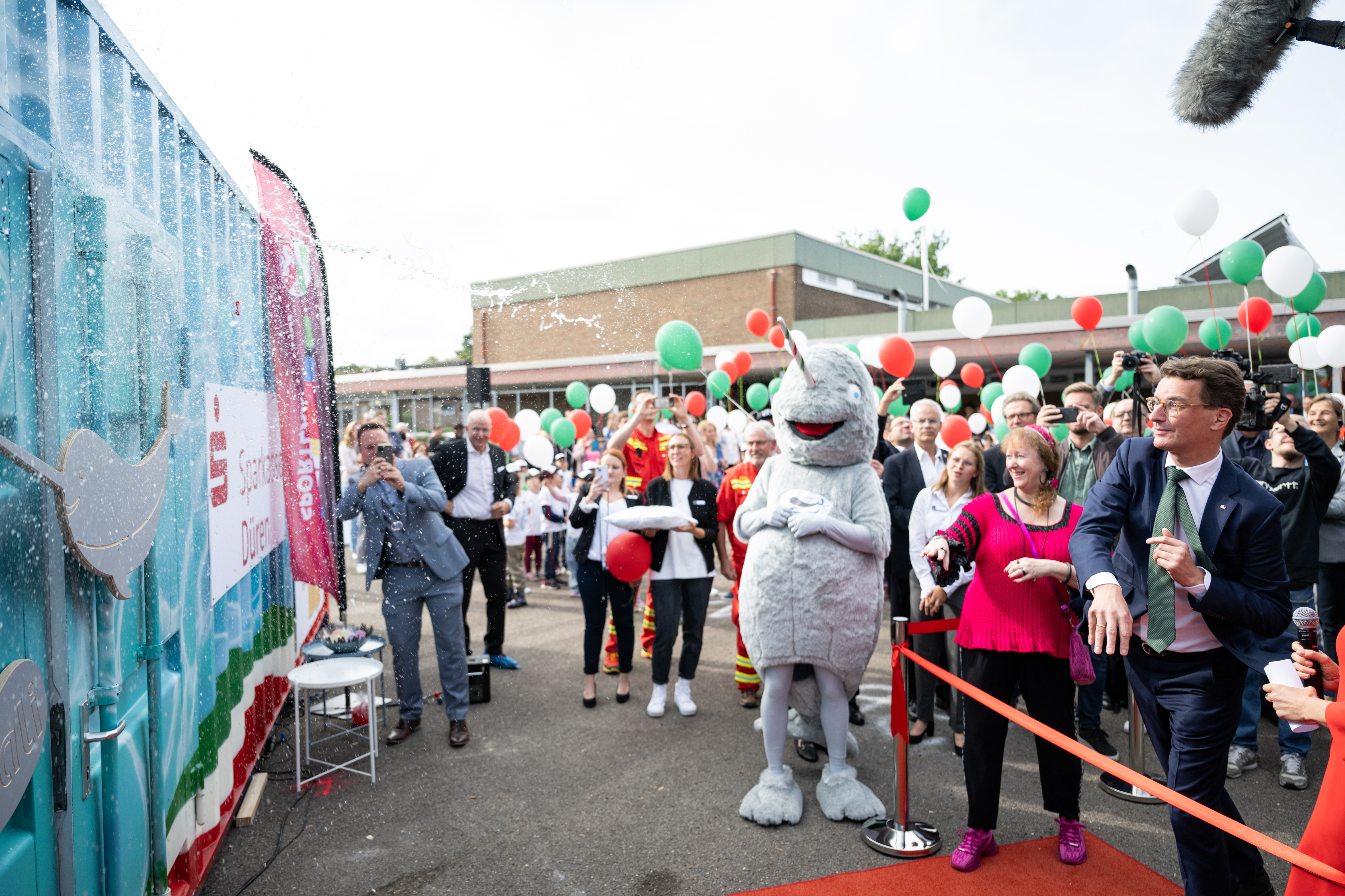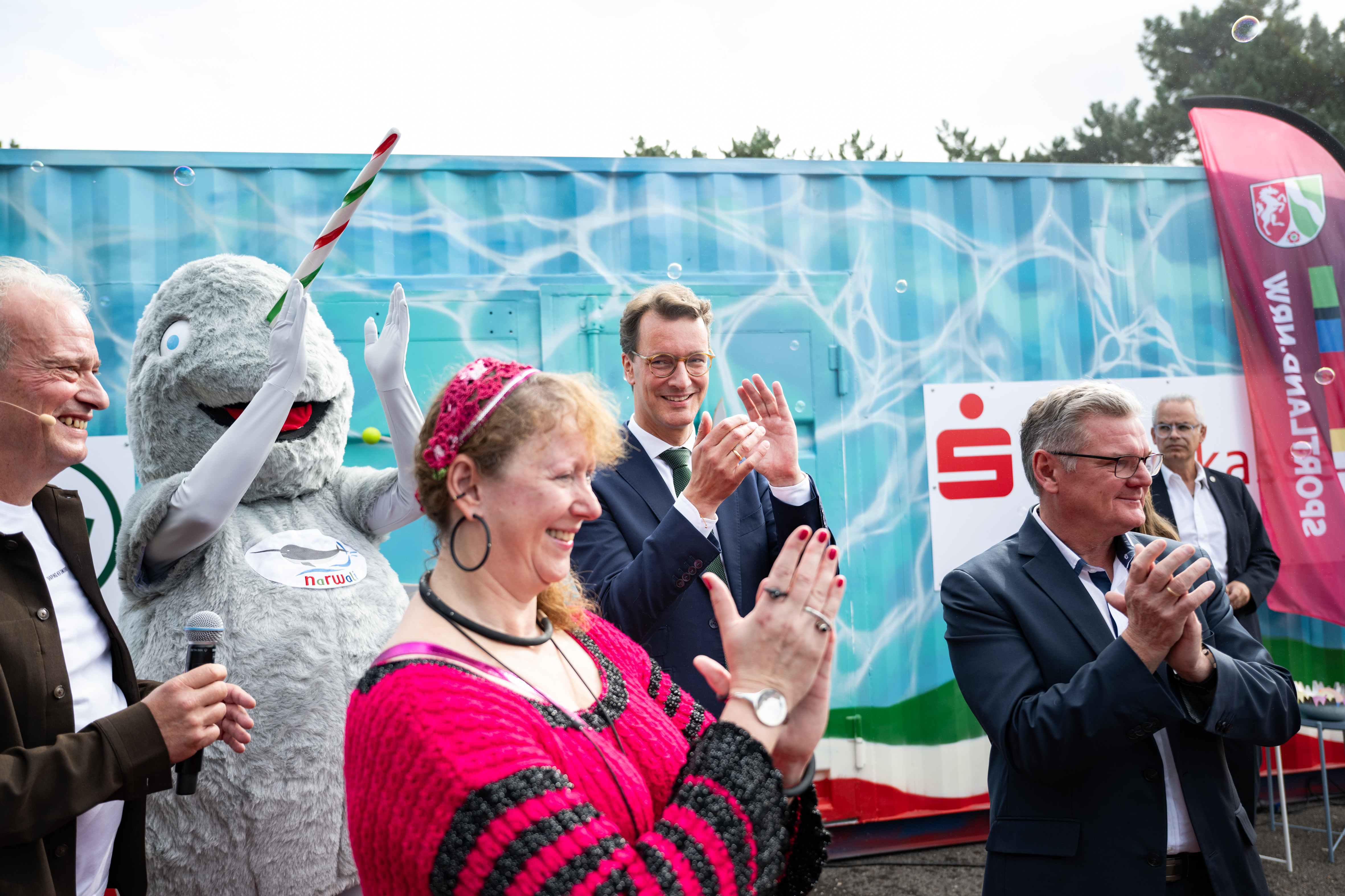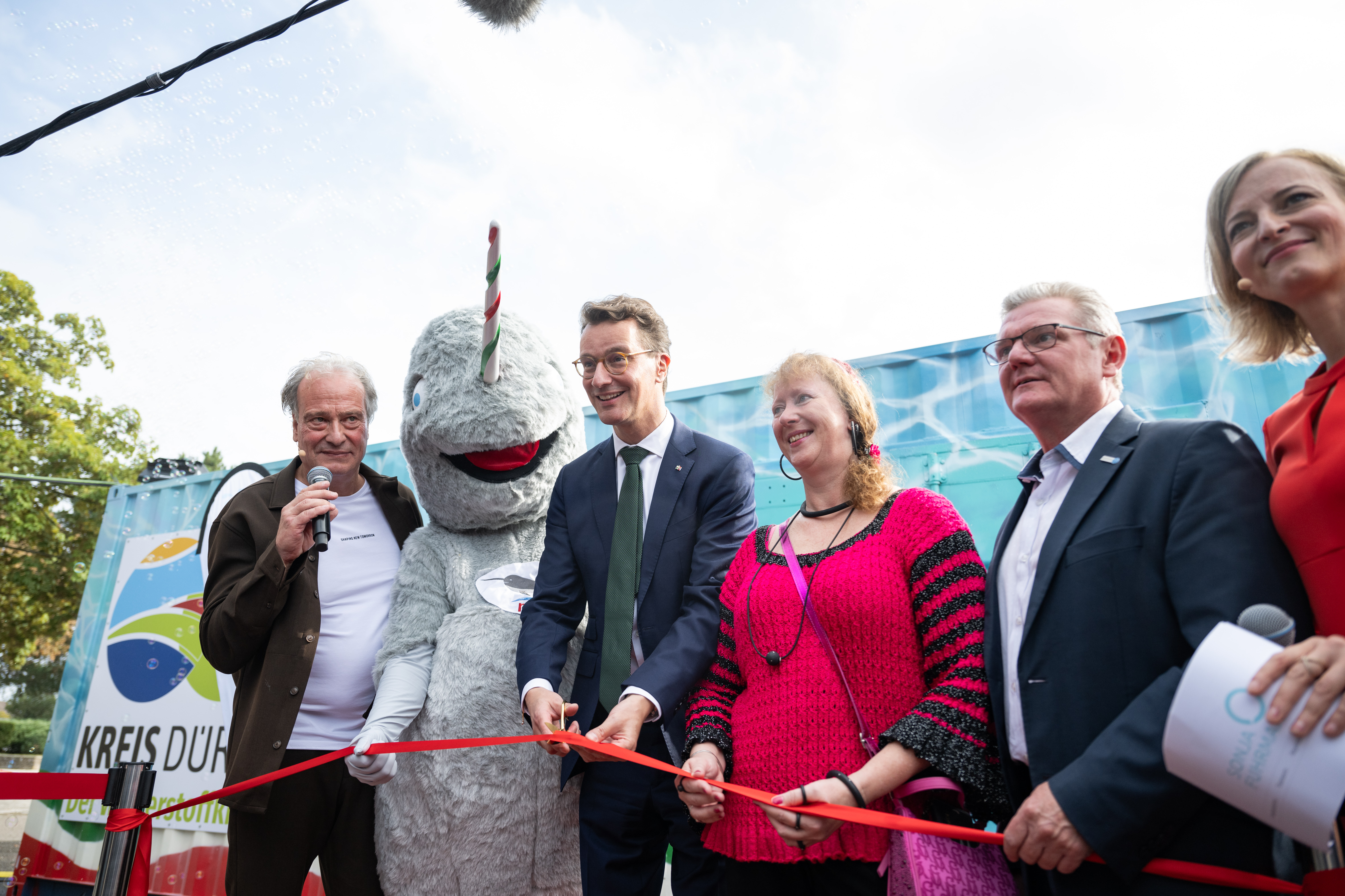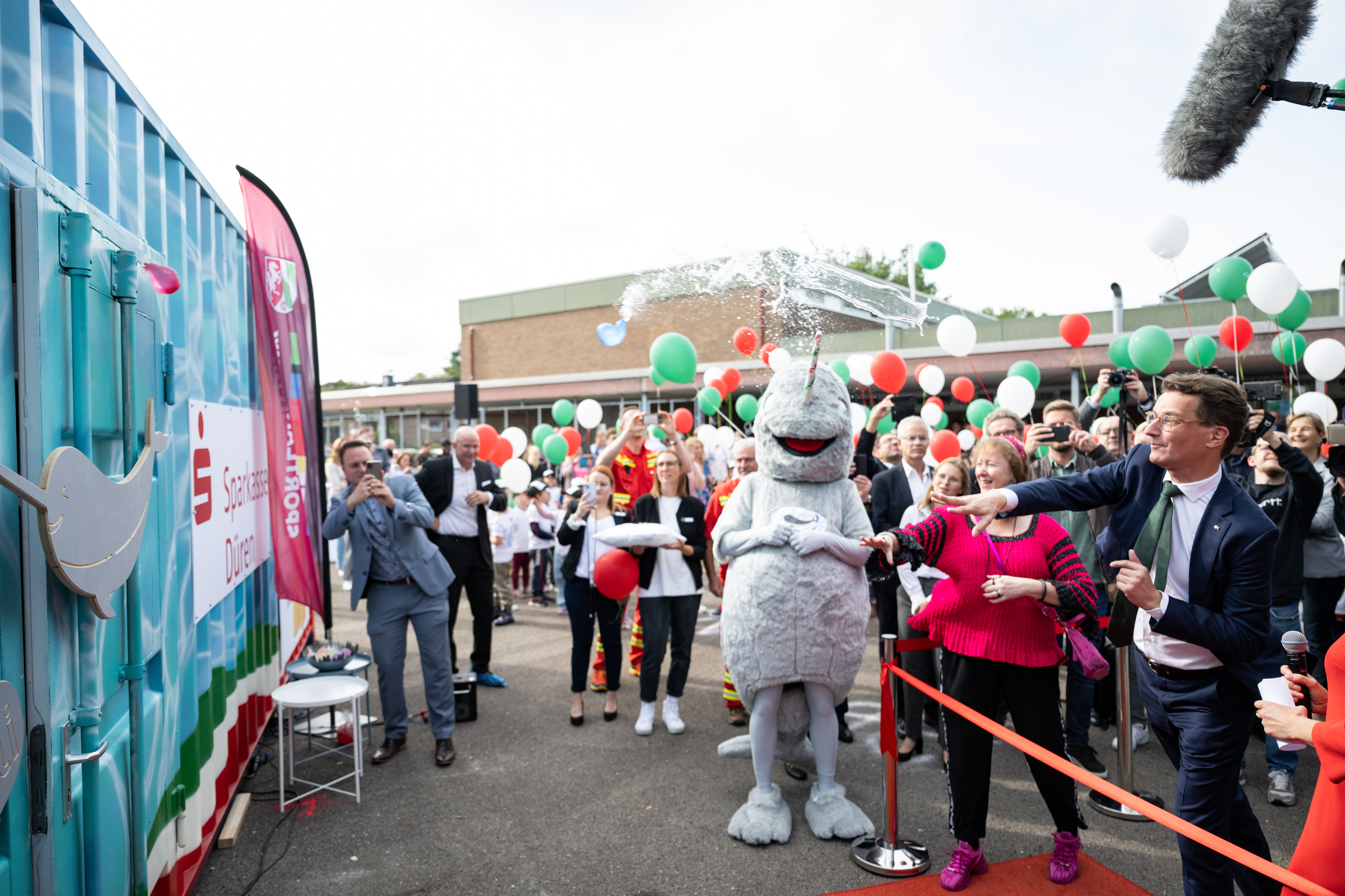 Bunt und begeistert ging es zu, als Ministerpräsident Hendrik Wüst gemeinsam mit der Staatssekretärin für Sport und Ehrenamt Andrea Milz am Donnerstag das rote Band zur Eröffnung des ersten mobilen Schwimmcontainers des Modellvorhabens „narwali“ in Düren durchschnitten. Luftballons in den Landesfarben, Musik und unzählige Seifenblasen sorgten für den passenden Rahmen auf dem Schulhof des Grundschulverbandes Lendersdorf-Niederau. Mit dabei war auch der Kreissportbund Düren als Projektträger.