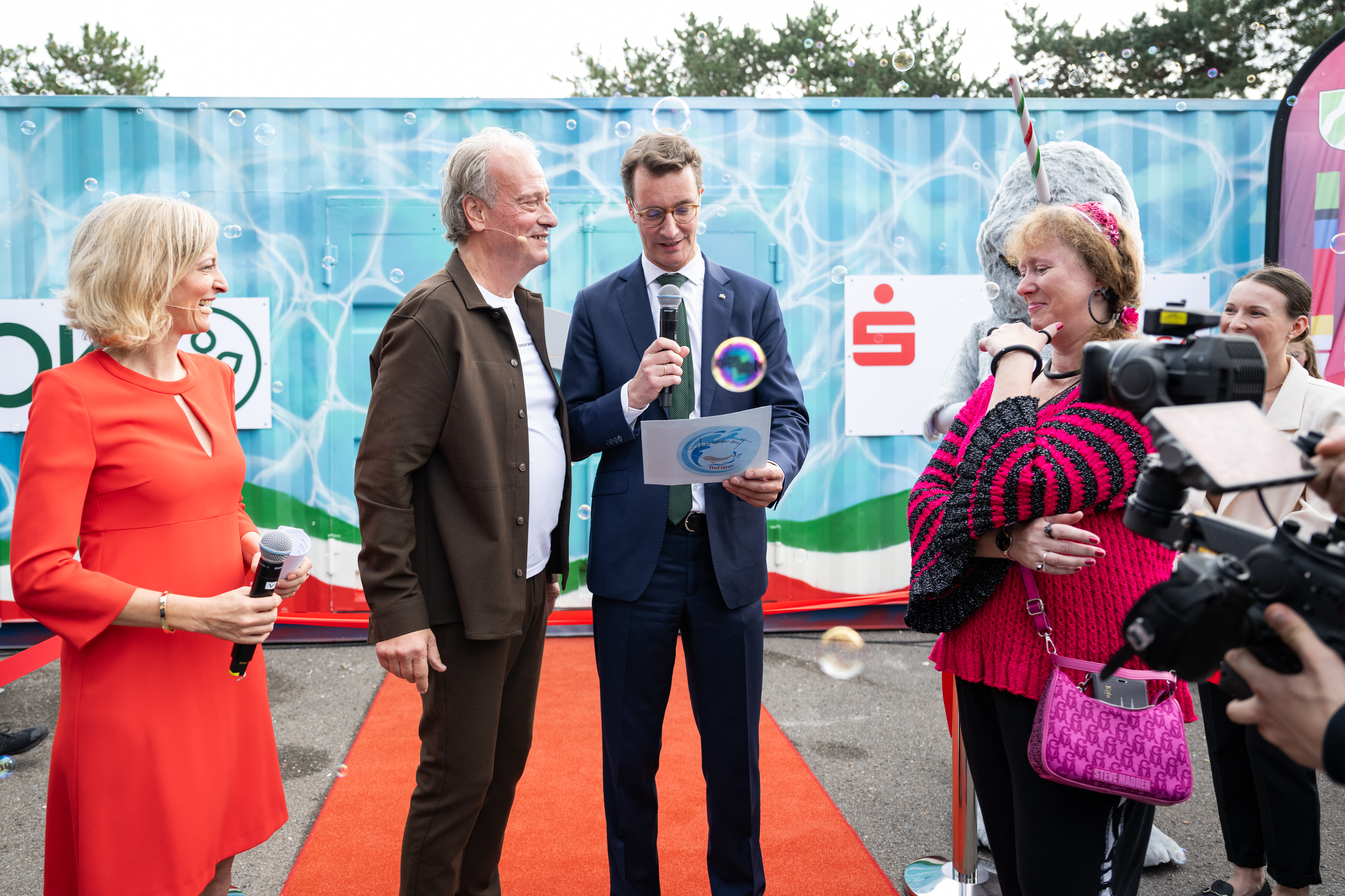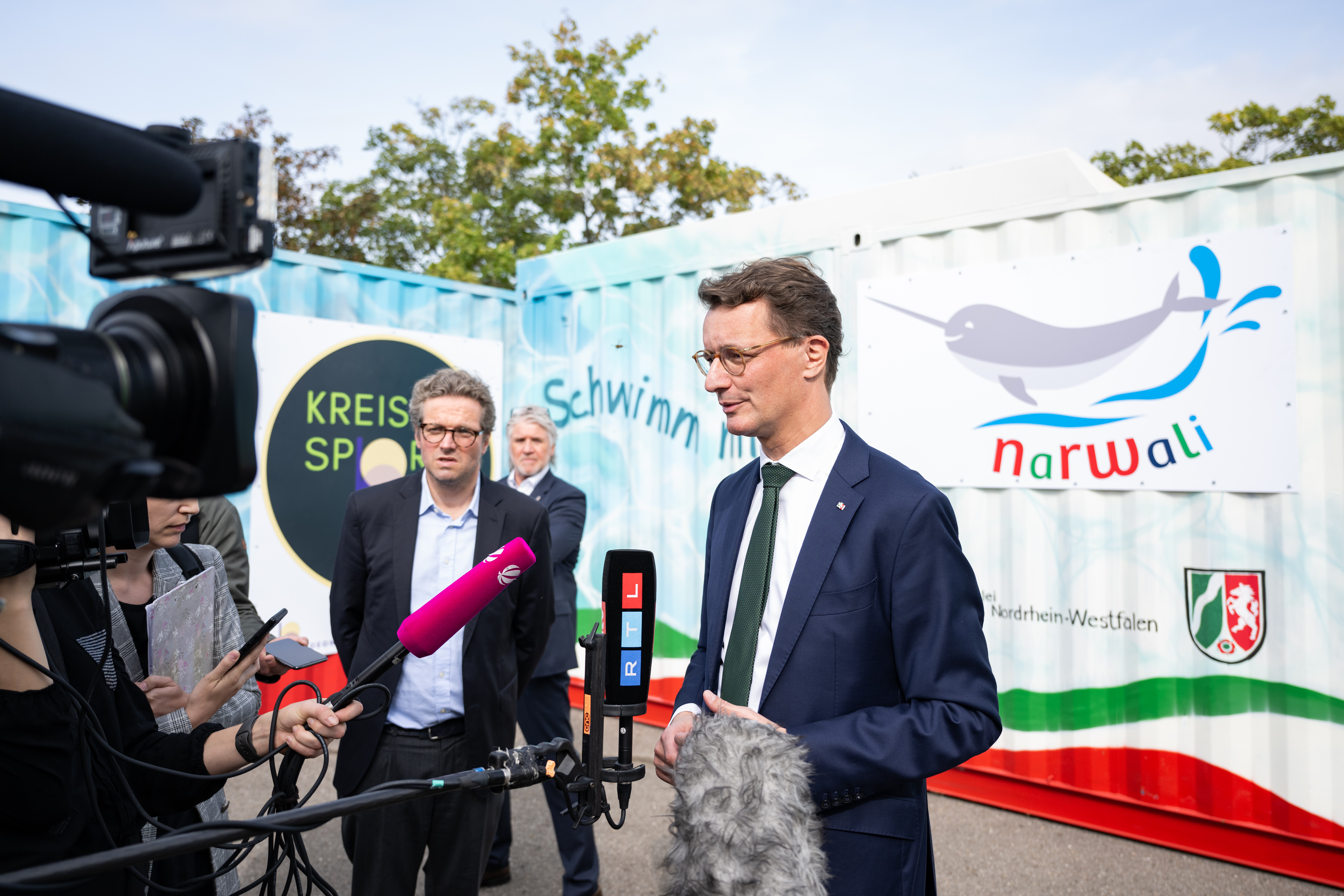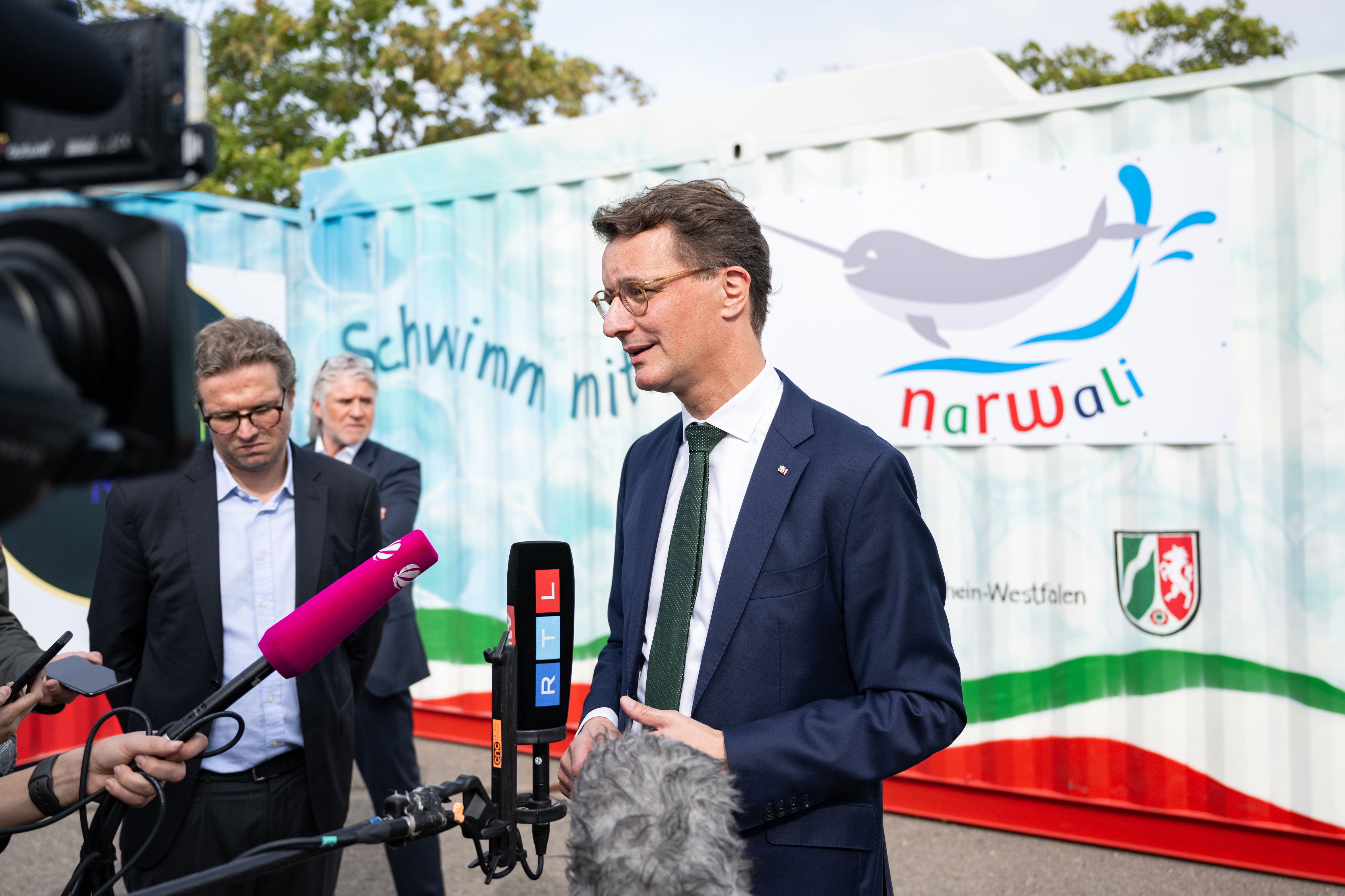 Ministerpräsident Hendrik Wüst hat in Düren den ersten mobilen Schwimmcontainer des Projekts „narwali“ eingeweiht. Wichtigstes Ziel des Modellvorhabens ist die Schaffung eines niedrigschwelligen Angebots zur Wassergewöhnung – damit Kinder lernen, sich sicher im nassen Element zu bewegen.