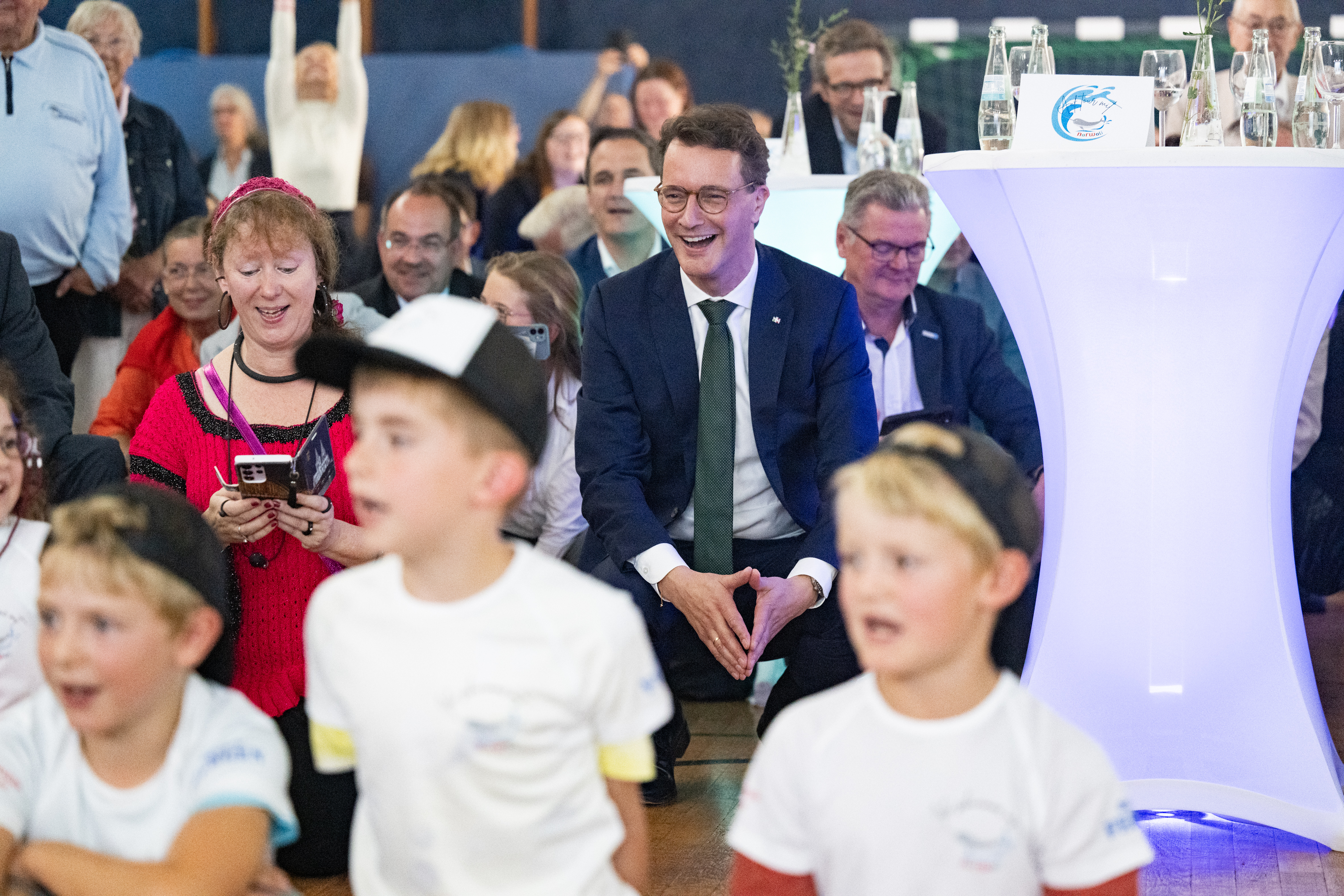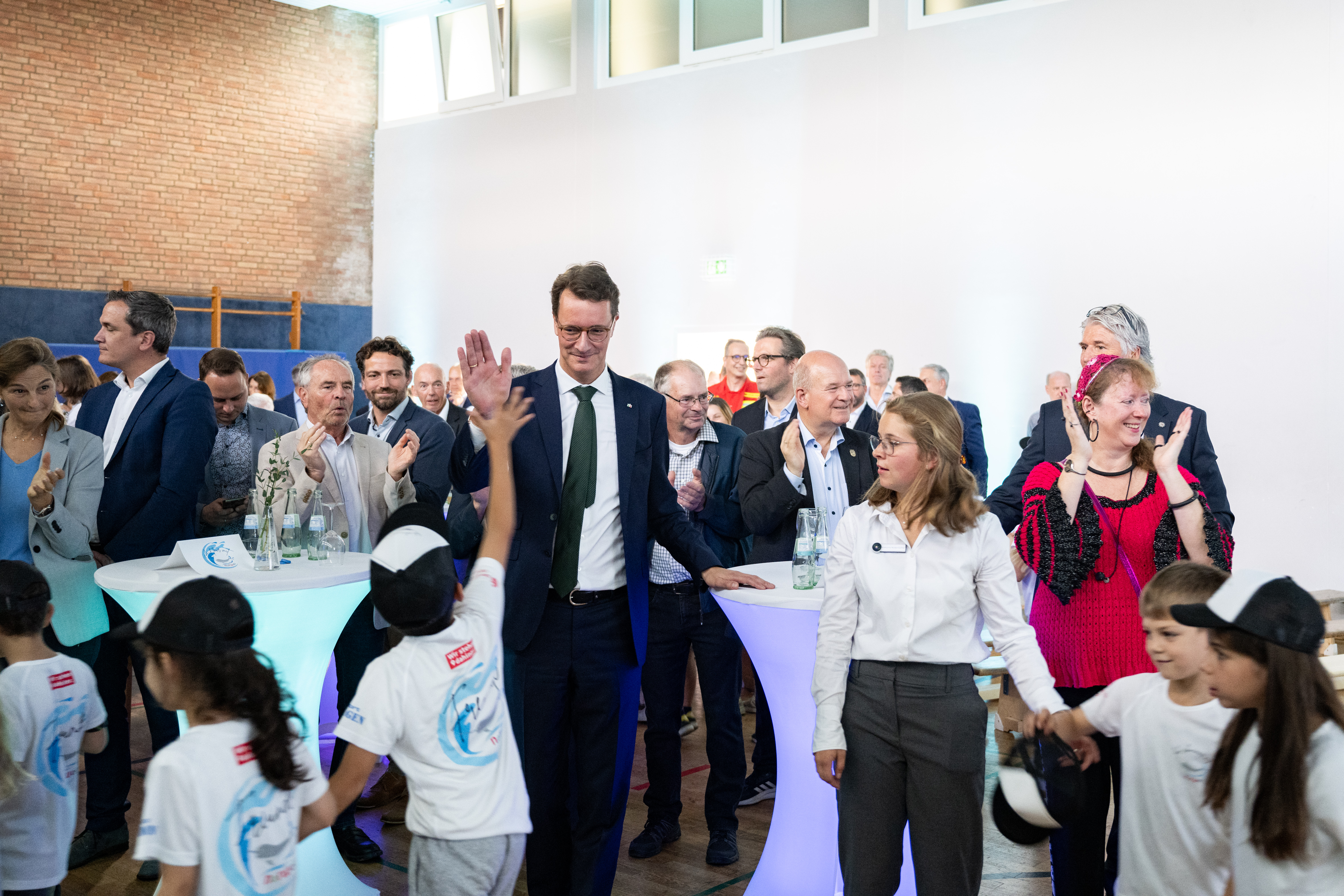 „Sicher schwimmen macht nicht nur Spaß, es kann überlebenswichtig sein“, erklärte Ministerpräsident Hendrik Wüst bei der Einweihung des ersten mobilen Schwimmcontainer im Rahmen des Modellvorhabens „narwali“. Mit dabei waren in Düren die Staatssekretärin für Sport und Ehrenamt Andrea Milz, der Kreissportbund Düren als Projektträger – und viele begeisterte Schülerinnen und Schüler des Grundschulverbandes Lendersdorf-Niederau.