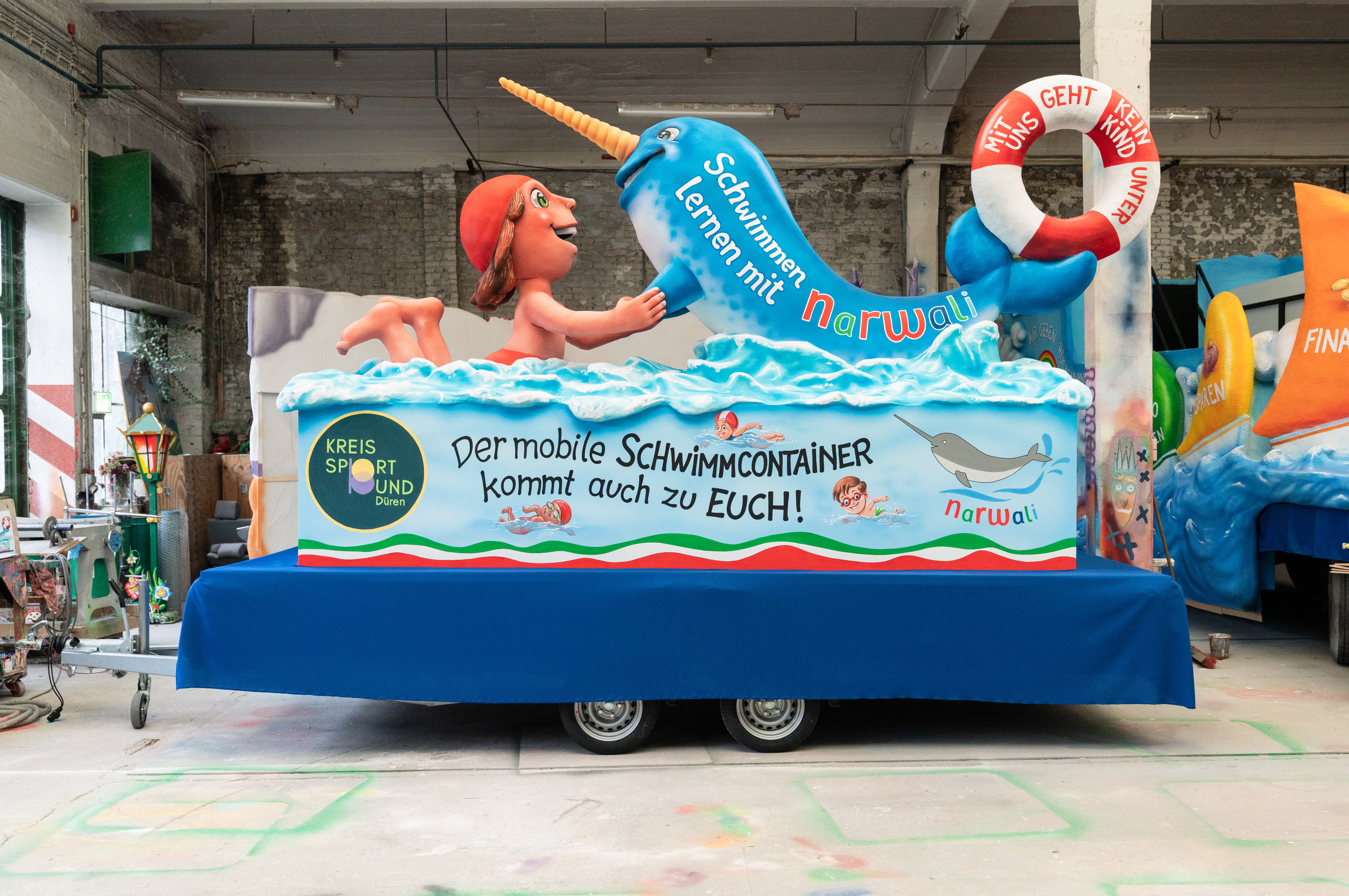 Wenige Wochen vor dem Straßenkarneval spachtelt, schleift und pinselt das Team von Karnevalswagenbau-Künstler Jacques Tilly in einer Werkhalle in Düsseldorf auf Hochtouren. Wetterfest und stoßfest habe man gebaut, so Jacques Tilly, denn dieser besondere Mottowagen soll lange halten. Er spricht vom „narwali“-Wagen für den Rosenmontagszug in Düsseldorf, den er auf Initiative des Kreissportbundes Düren als Projektträger gebaut hat.